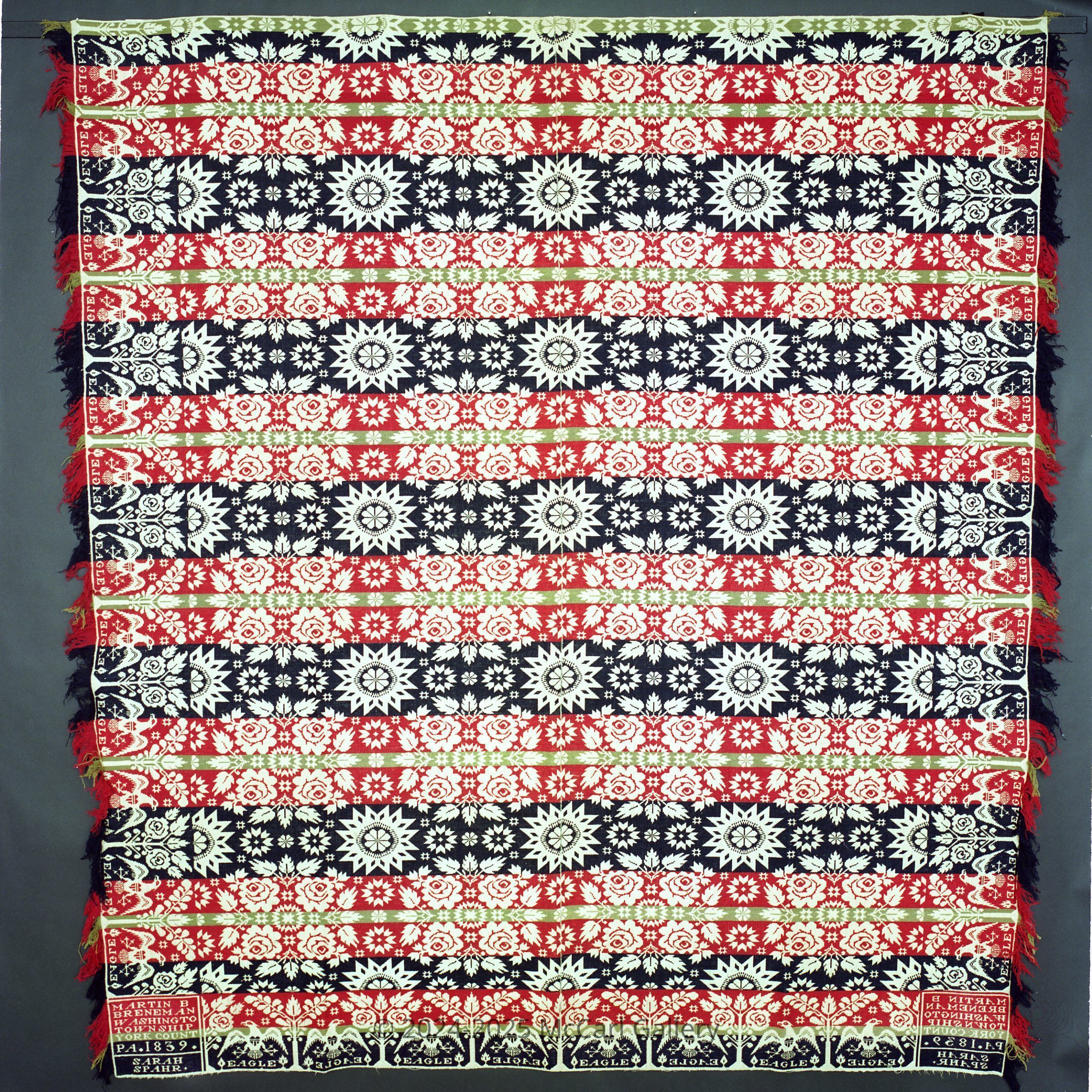 Beiderwand; red, navy, green, natural; fringe on 2 sides; 2 corner blocks; two loom widths joined; border on 3 sides of ferns, flowers, and eagles with the word "eagle" repeated under each eagle; centerfield of rows of stars and rosette clusters, strips of colorCollection