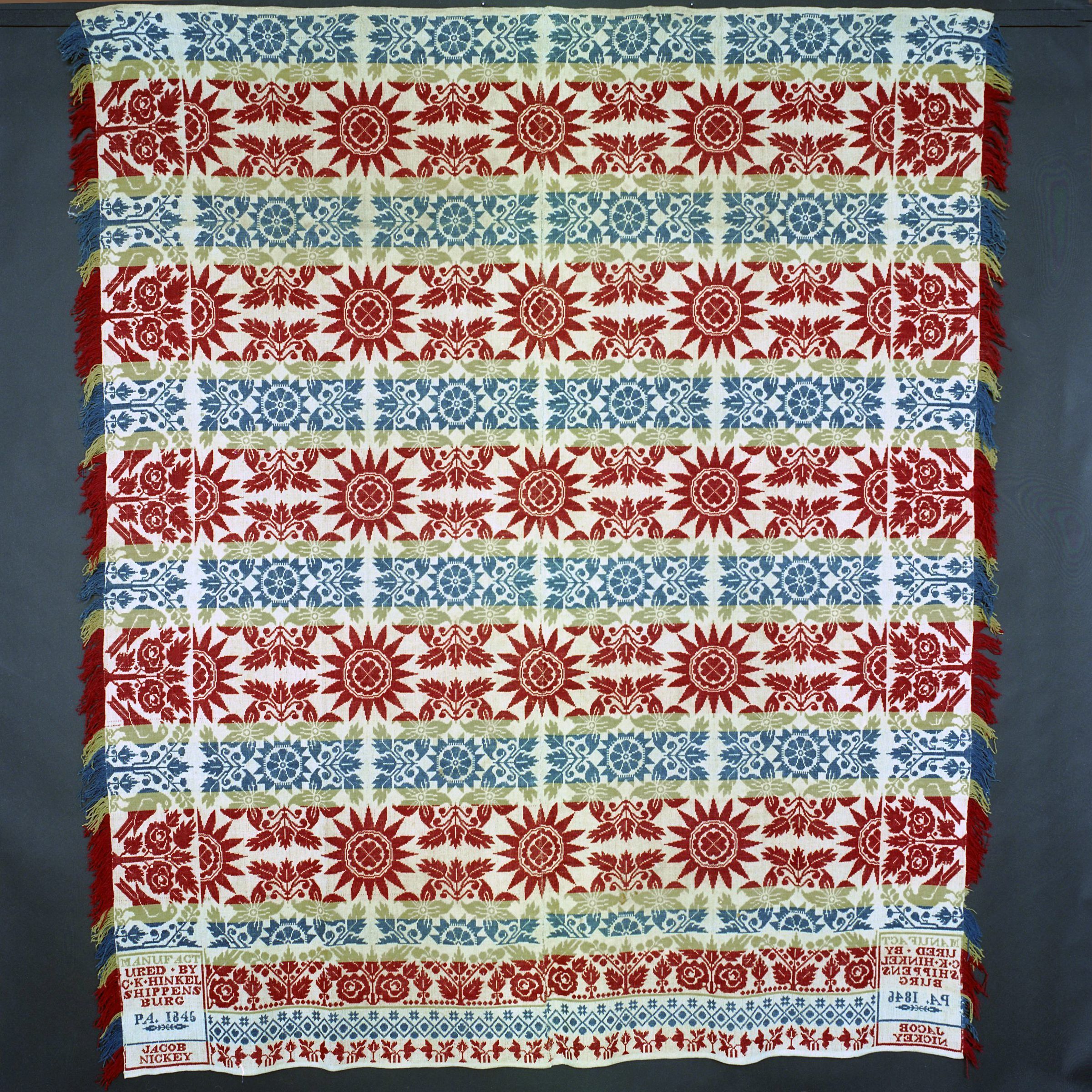 Beiderwand; blue, red, yellow, natural; fringe on 2 sides; 2 corner blocks; two loom widths joined; side borders of distelfinks and flowers; bottom border of diamonds, stars, and flowers; centerfield of rows of flowers and stars, strips of colorCollection