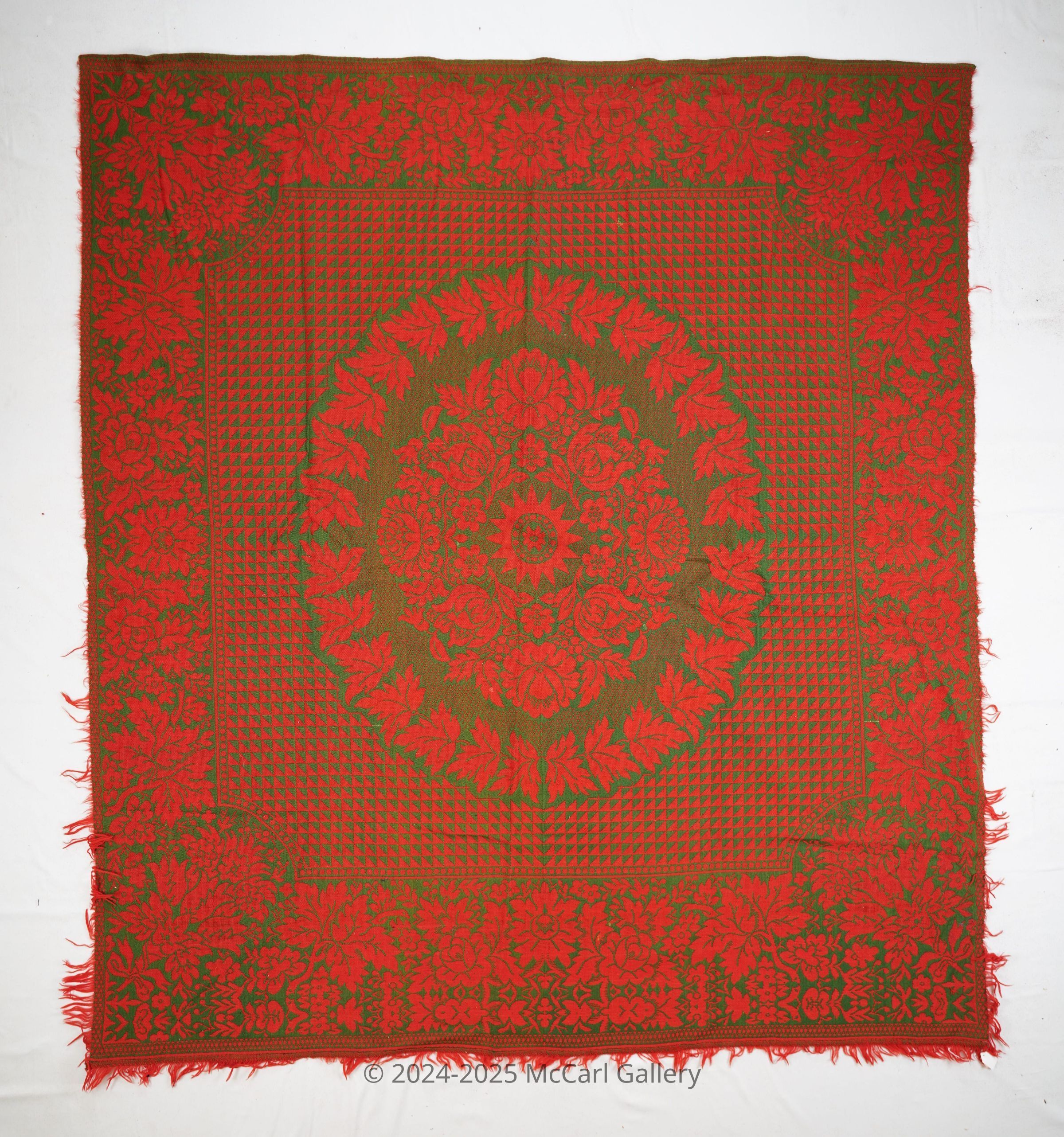 Red and green figured Double weave coverlet; seamless. Fringe on three sides, border on four sides.