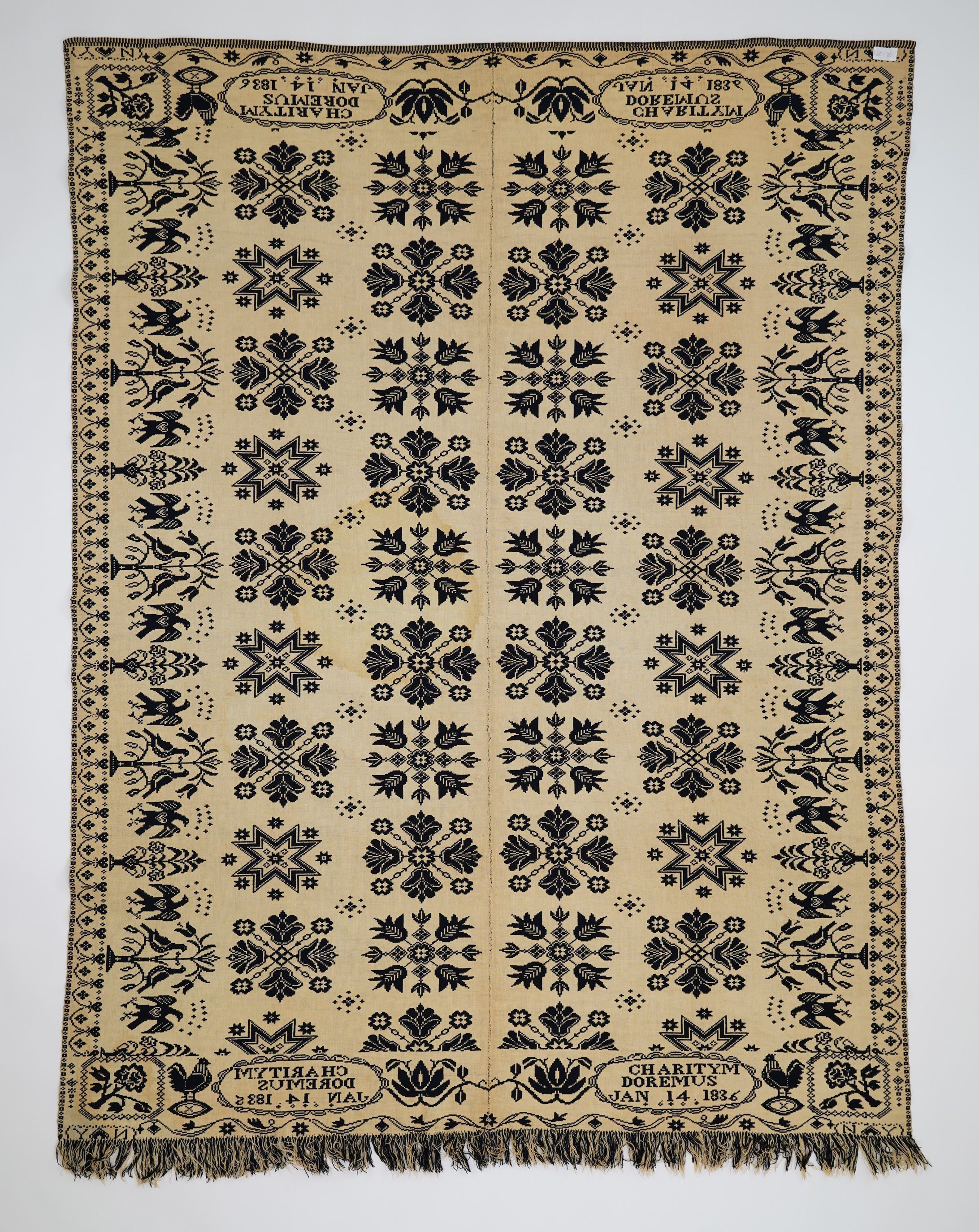 Double weave; navy, natural, seamless; self fringe on bottom, 2 loom widths; side outer borders have small hearts and swag; top and bottom outer border have leaves, stars, and swag; side inner borders of eagles, distelfinks, stars, and plants; top and bottom inner border has chickens, flowers and inscription; centerfield contains rows of floral and starry medallions; four corner blocks with flower inside square