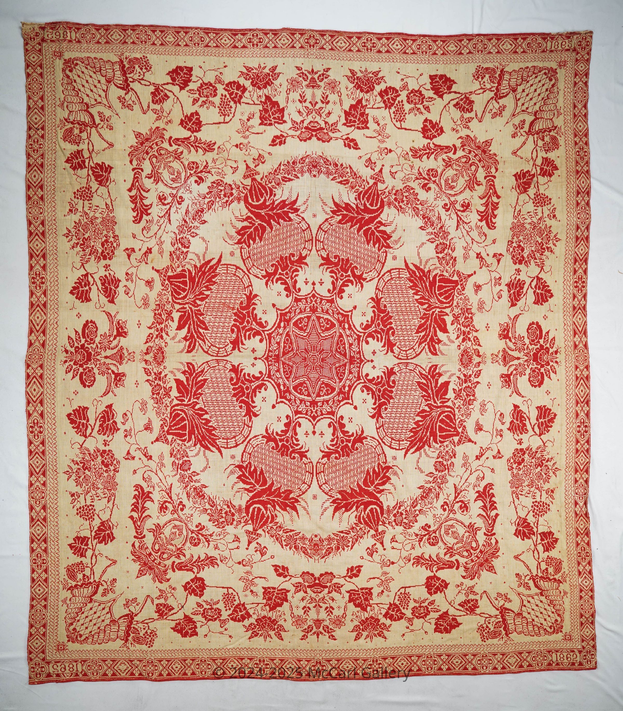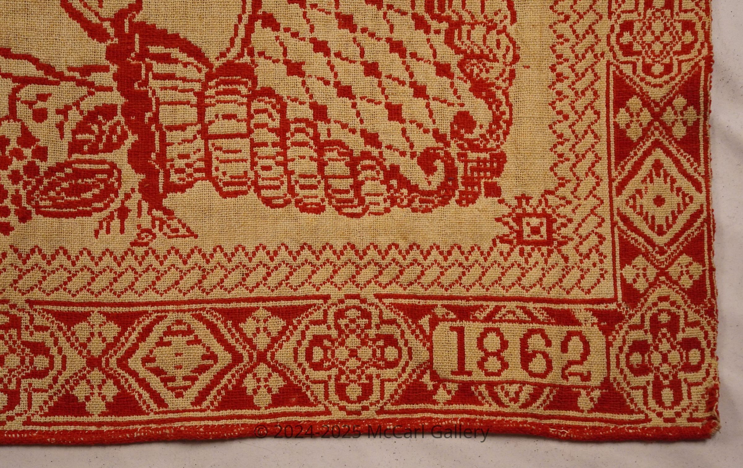 Natural and red figured true beiderwand coverlet; seamless. Border on four sides; no fringe.Collection