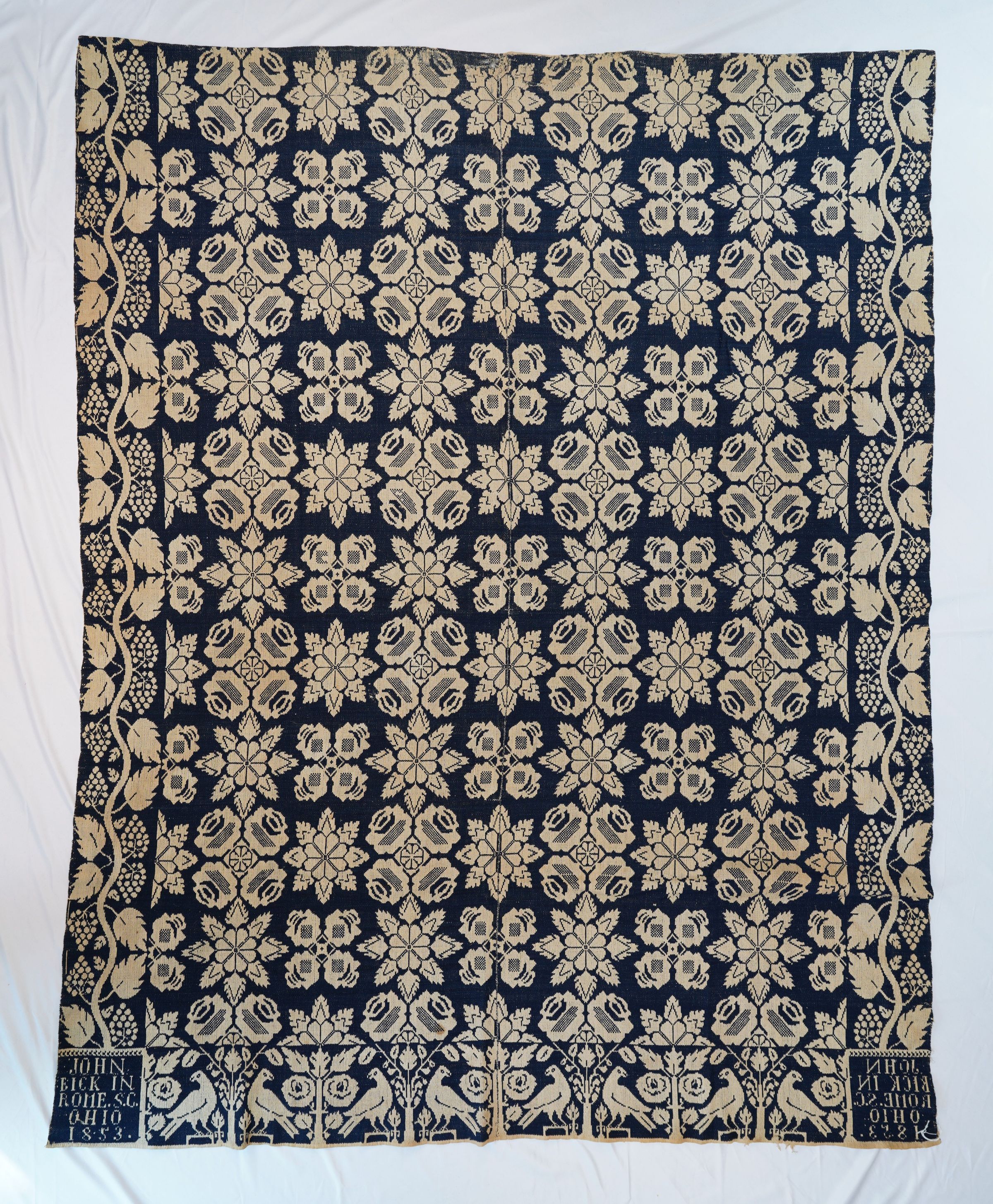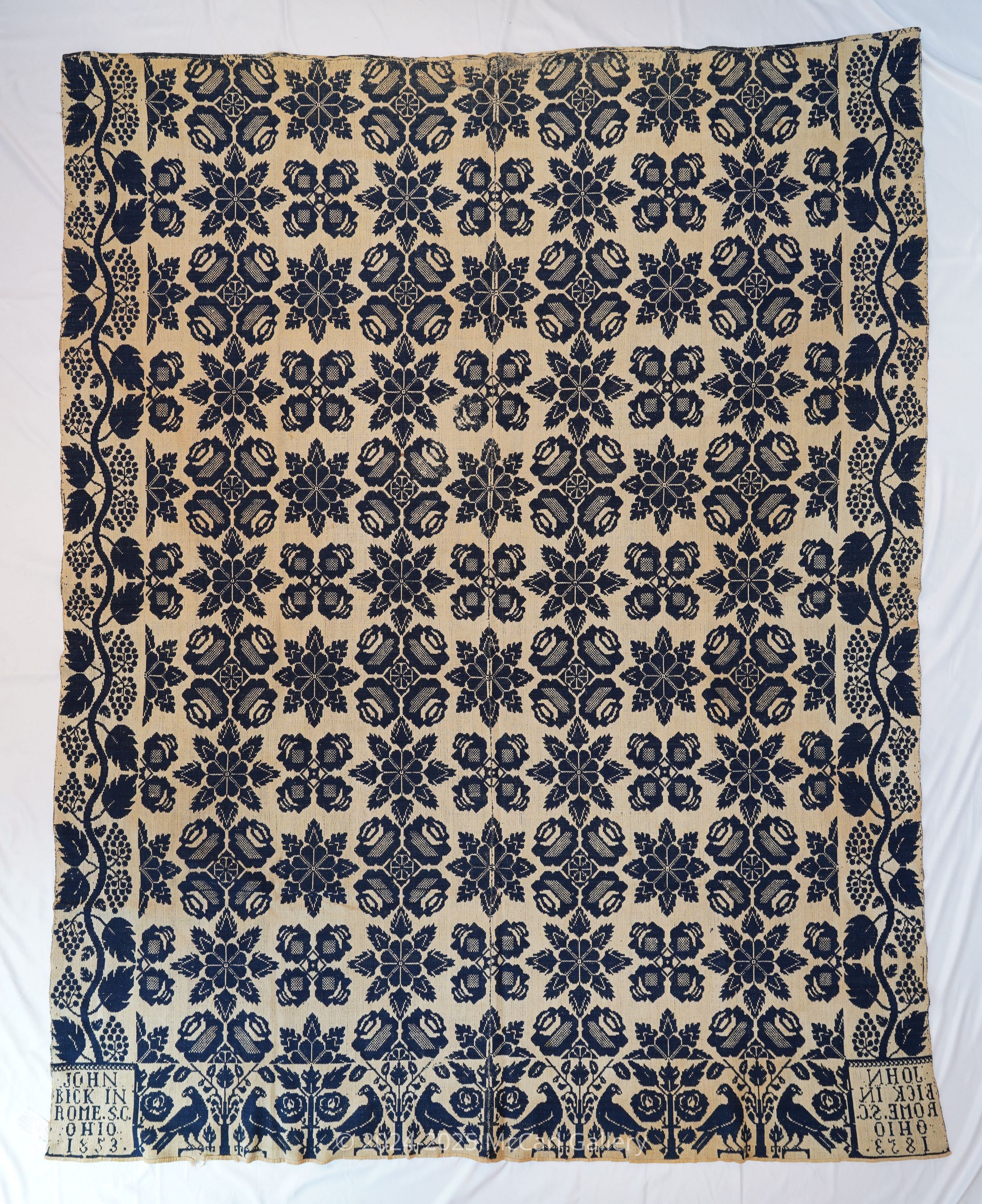 Navy and natural figured tied Beiderand coverlet; two panels joined. Double flowers and snowflakes centerfield pattern with distelfink border on bottom and grapevine border on sides. No fringe.Collection
