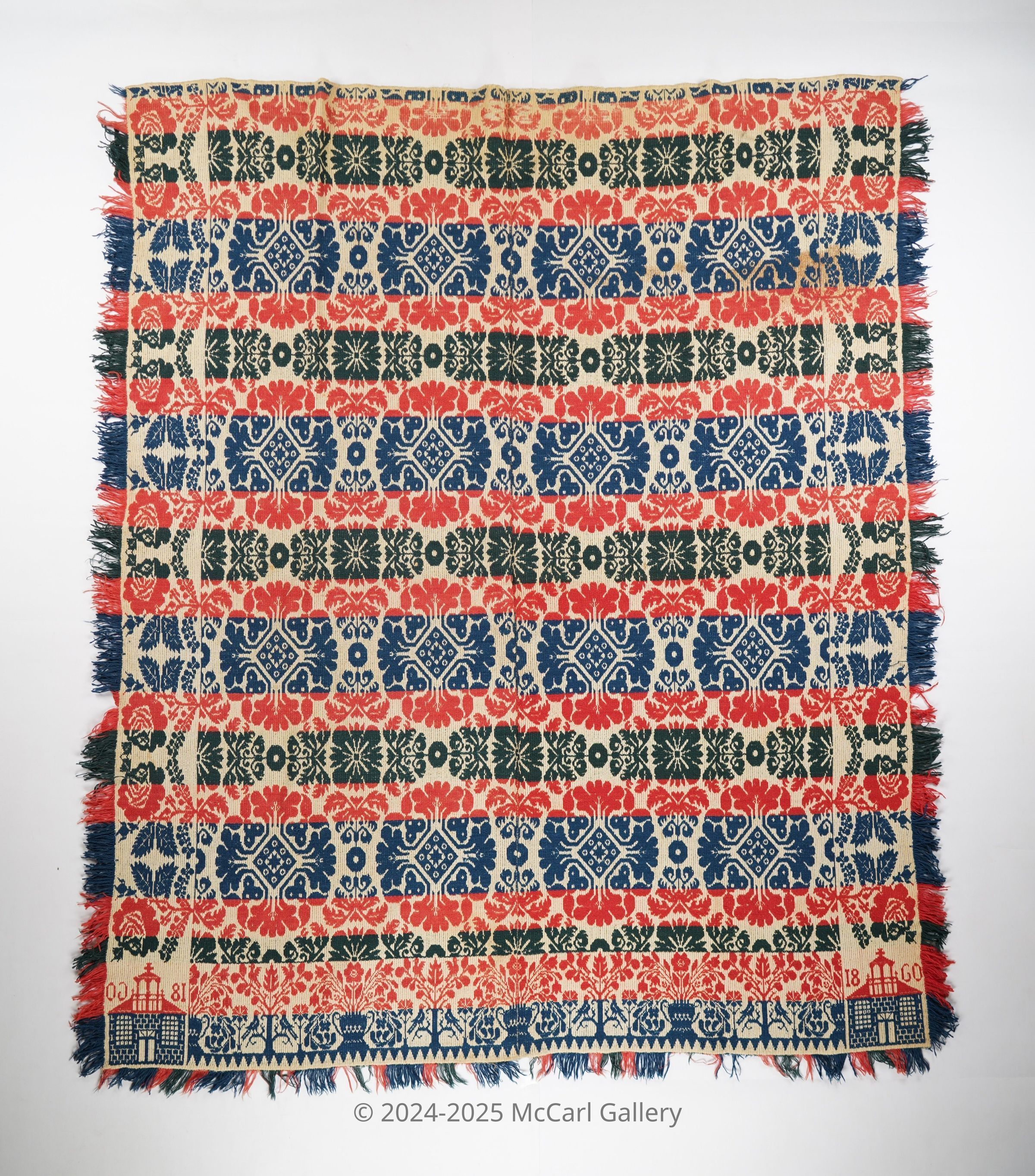 Figured and fancy tied beiderwand coverlet with borders on three sides, self-fringe on sides, and applied fringe on bottom. Two panels joined by a center seam. Navy, dark green, and red wool with undyed cotton. Floral medallion centerfield pattern; rose border on sides; flower urn border on bottom. Unknown weaver in 1860 with courthouse cornerblock.Collection