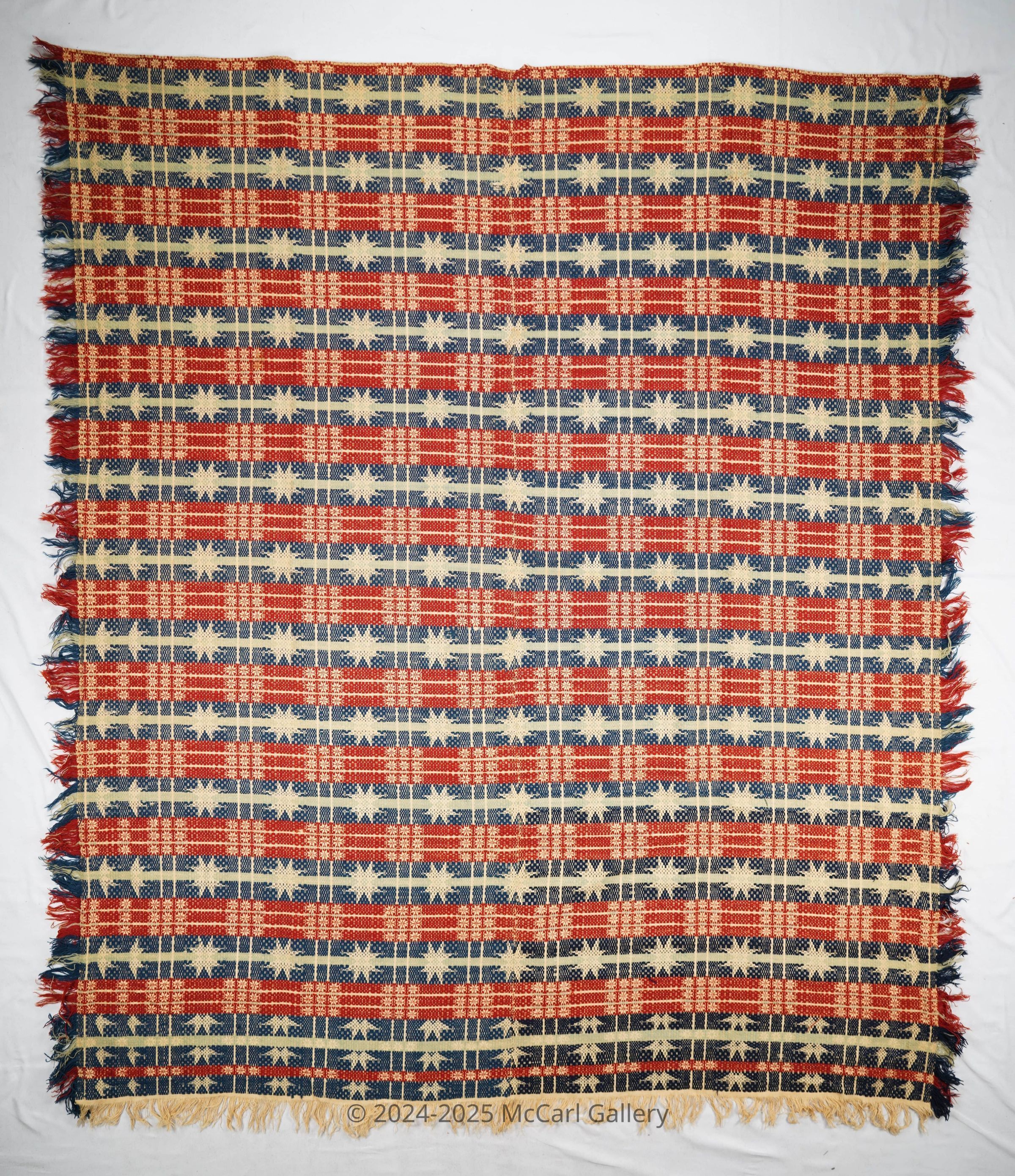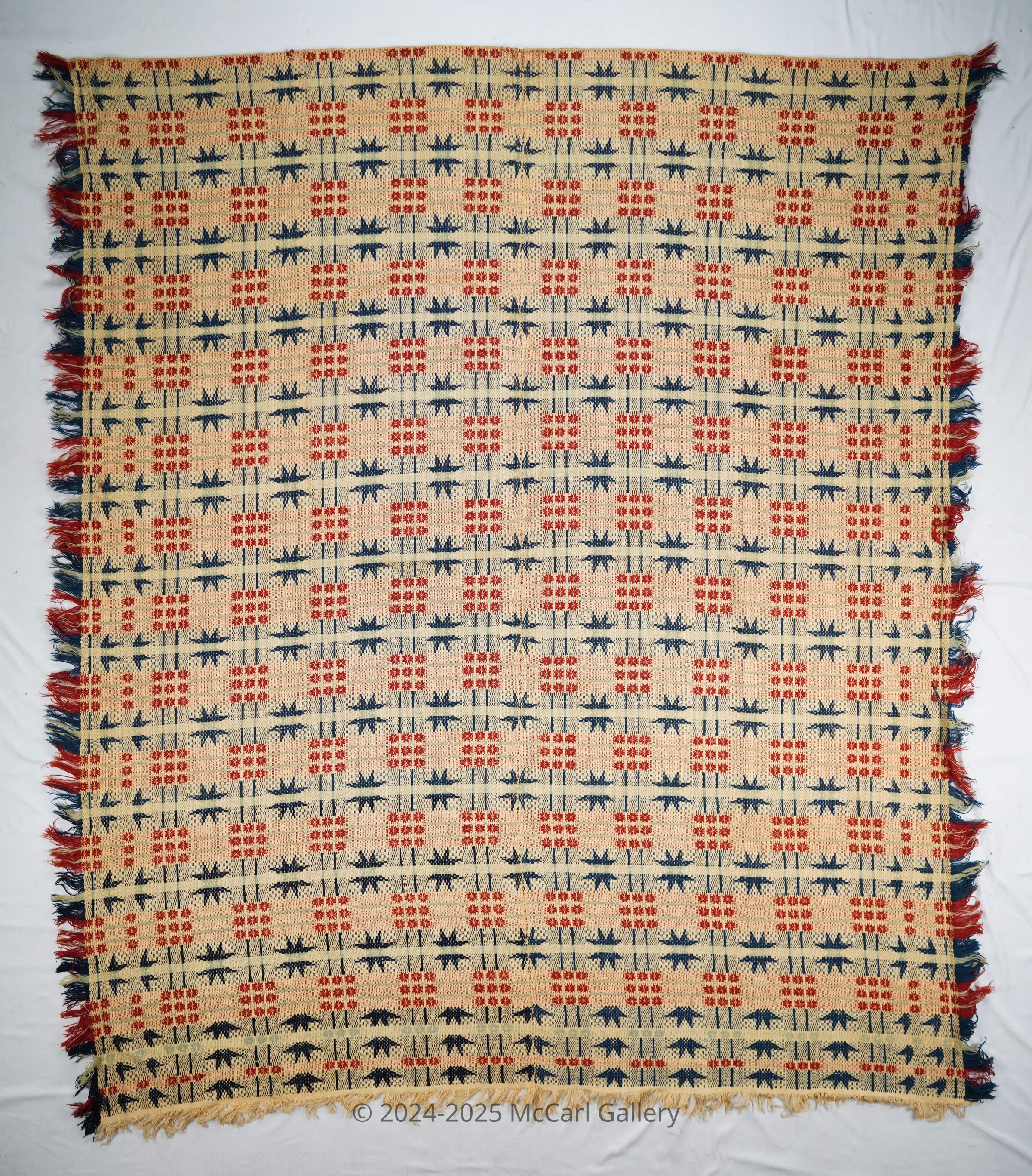 Natural, navy, light blue, and red geometric coverlet; two panels joined by a center seam. Border and fringe on three sides.Collection