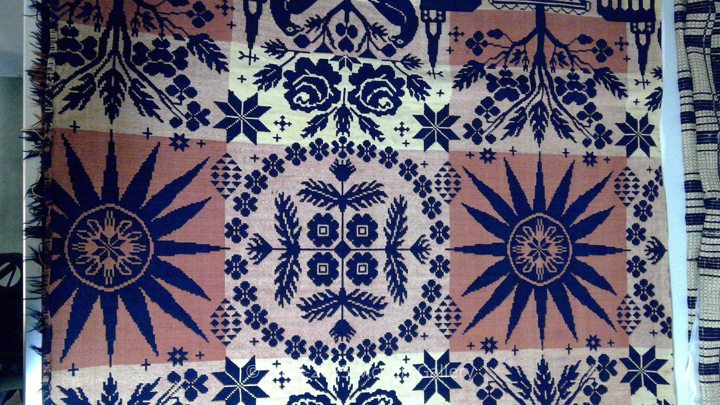 Double weave; two loom widths joined; natural, pink/salmon; navy; no fringe; border on 3 sides, on long sides are distelfinks, churches with weather vanes, and trees in baskets; bottom border of distelfinks and shorter trees in baskets; 2 corner blocks with inscription; centerfield of suns, wreaths, and quadruple rosette clusters on backdrop of large squares of colorCollection