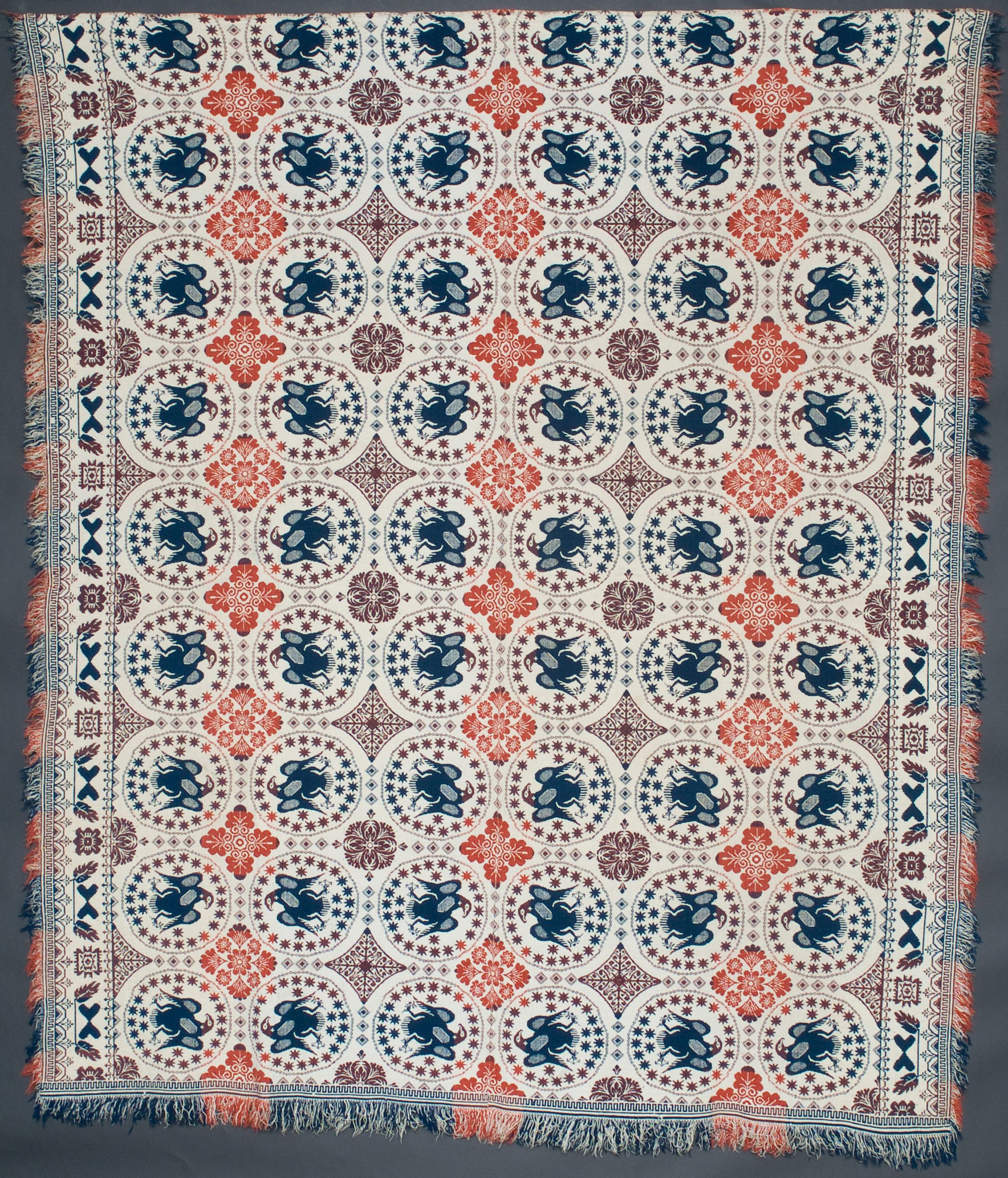 Double weave; two loom widths joined; navy, red-orange, natural (navy and red make a purple shade); fringe on 3 sides; border of leaves and hearts on side borders, no top and bottom borders; centerfield contains rows of "silver dollar" pattern (an eagle and stars in a circle) and floral diamond shapes, strips of colorCollection