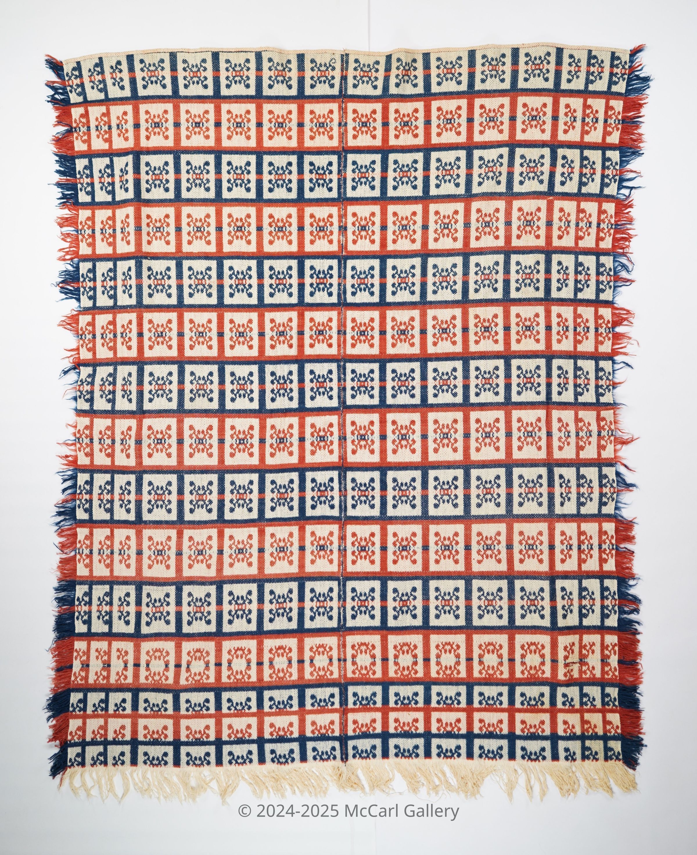 Red, navy, and natural geometric starwork coverlet with border and self-fringe on three sides. Two joined panels.