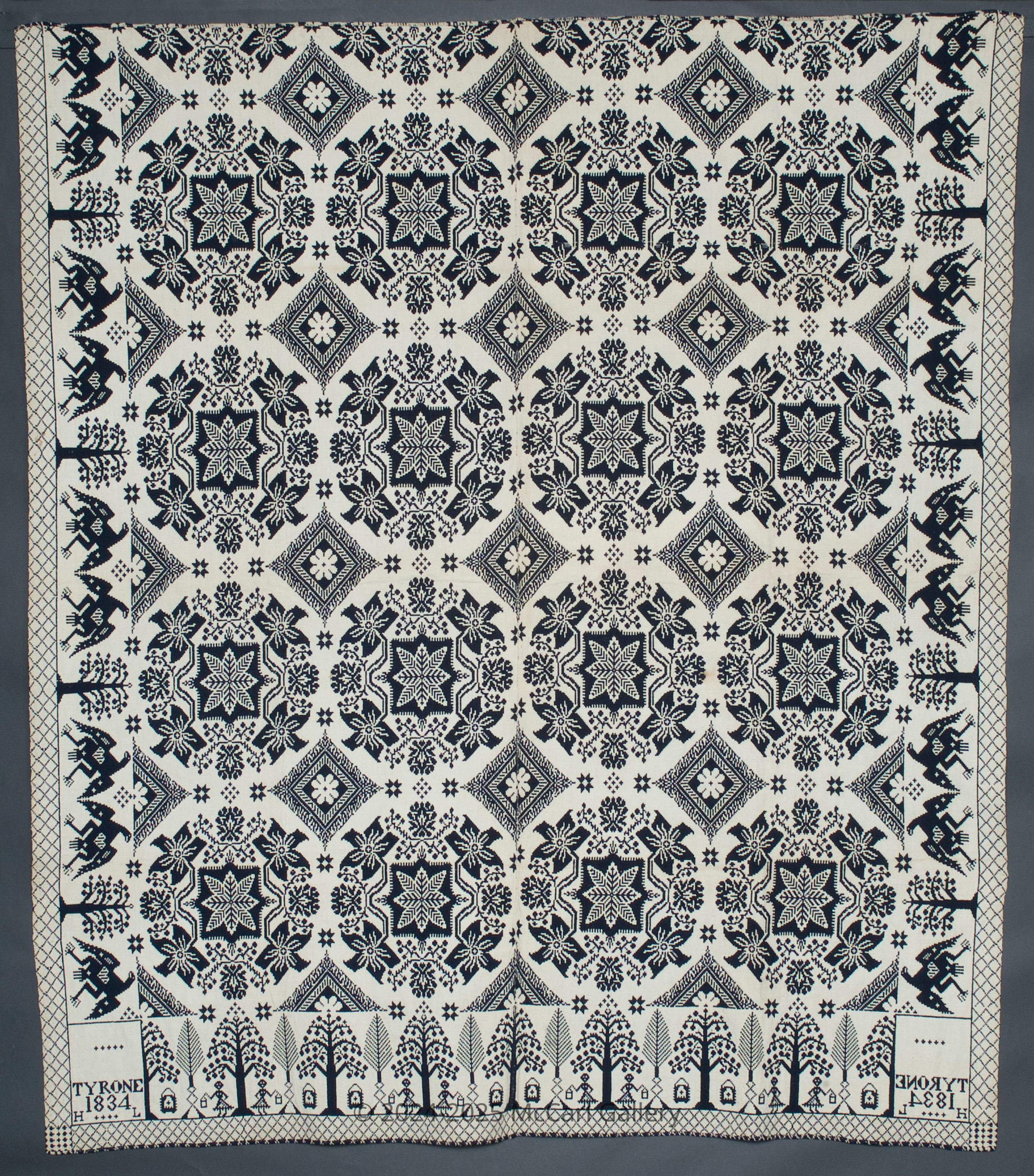 Double weave; navy, natural; two loom widths joined; no fringe; 2 corner blocks; two side borders of eagles, trees, and diamonds; bottom border of trees and women; no top border; centerfield of rows of floral medallionsCollection