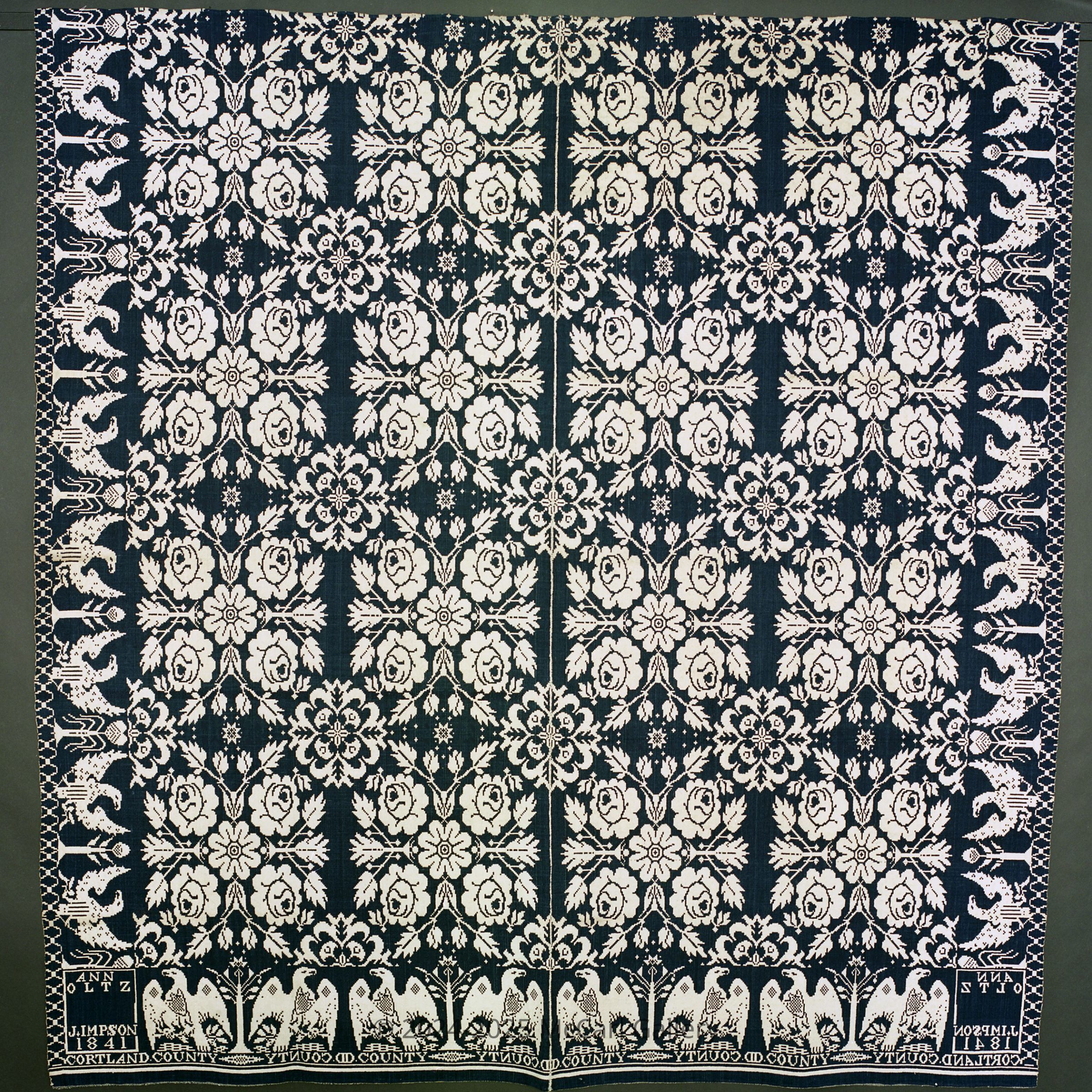 Double weave; navy, natural; two loom widths joined; no fringe; border on 3 sides of eagles and trees; centerfield of rows of rosette clusters; tiny stars in between; 2 corner blocksCollection