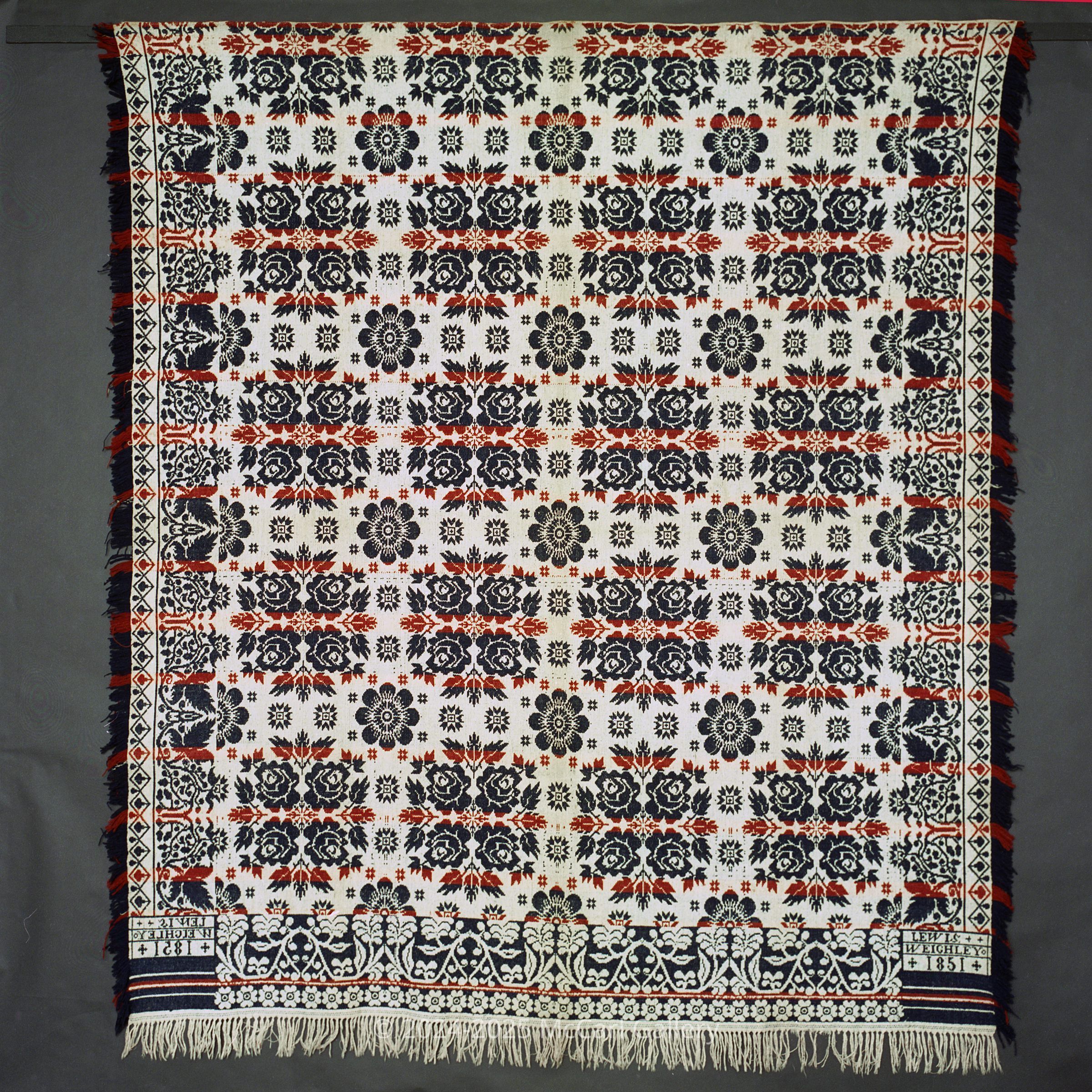 Beiderwand; navy, red, natural; fringe and border on 3 sides; seamless; side borders of leaves and vines; bottom border of flowers; centerfield of rows of rosette clusters, strips of colorCollection
