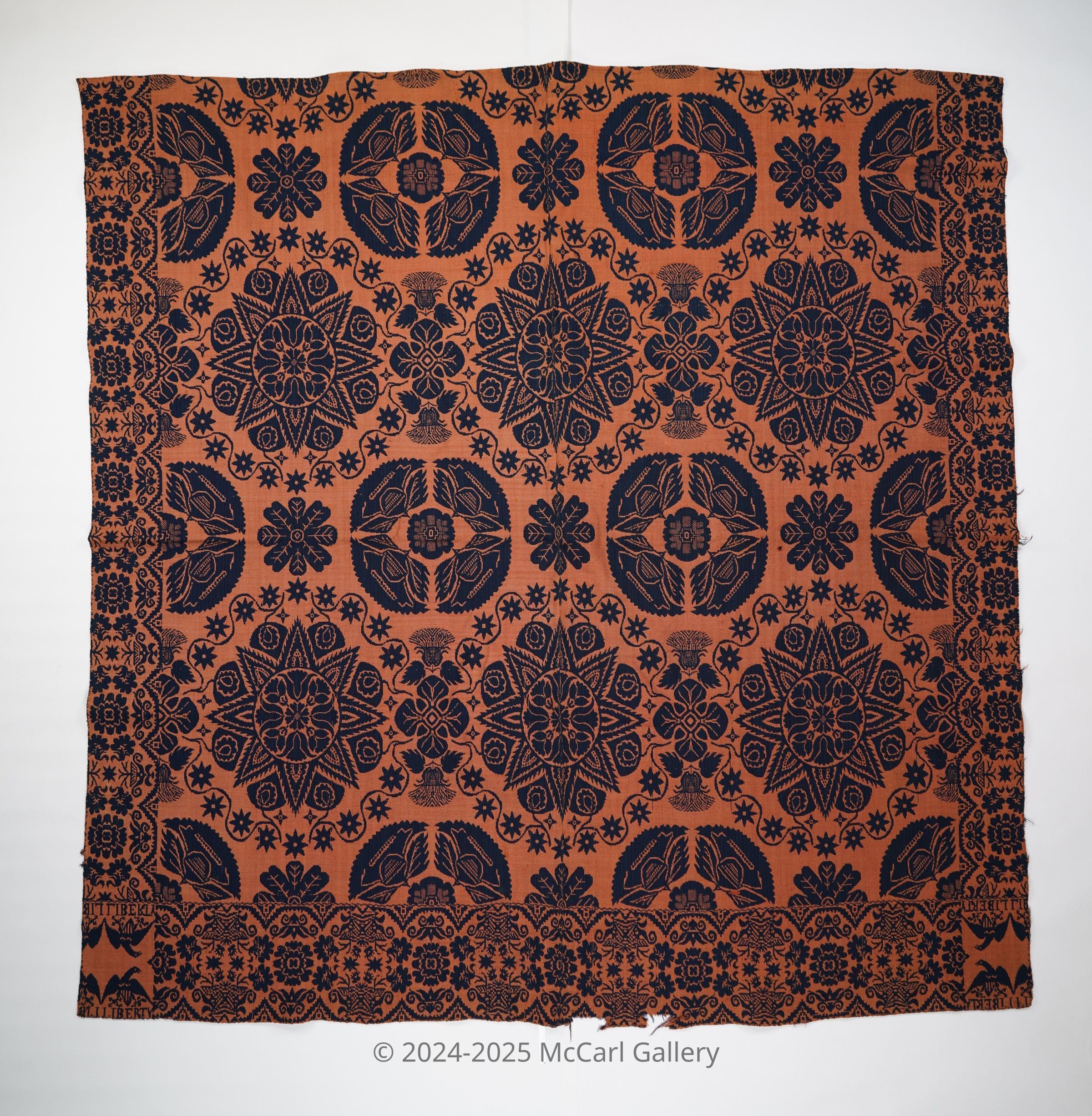 Red and navy figured doubleweave coverlet with border on three sides. Two joined panels.Collection