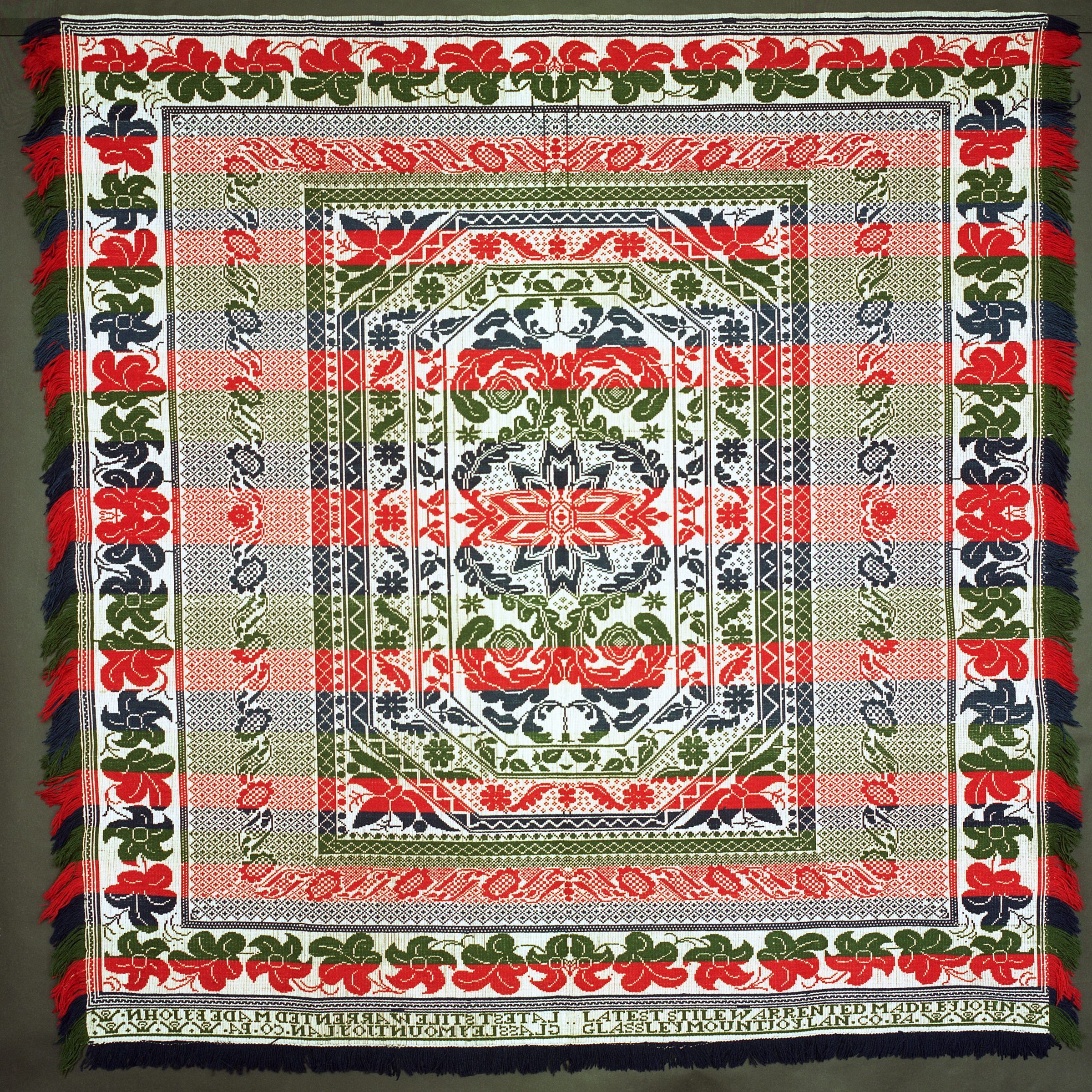 Beiderwand; navy, red, green, natural; seamless; fringe on 3 sides; border on 4 sides of flowers and leaves; floral center medallion surrounded by floral inner borders; no corner blocks; inscription on bottom strip; strips of colorCollection