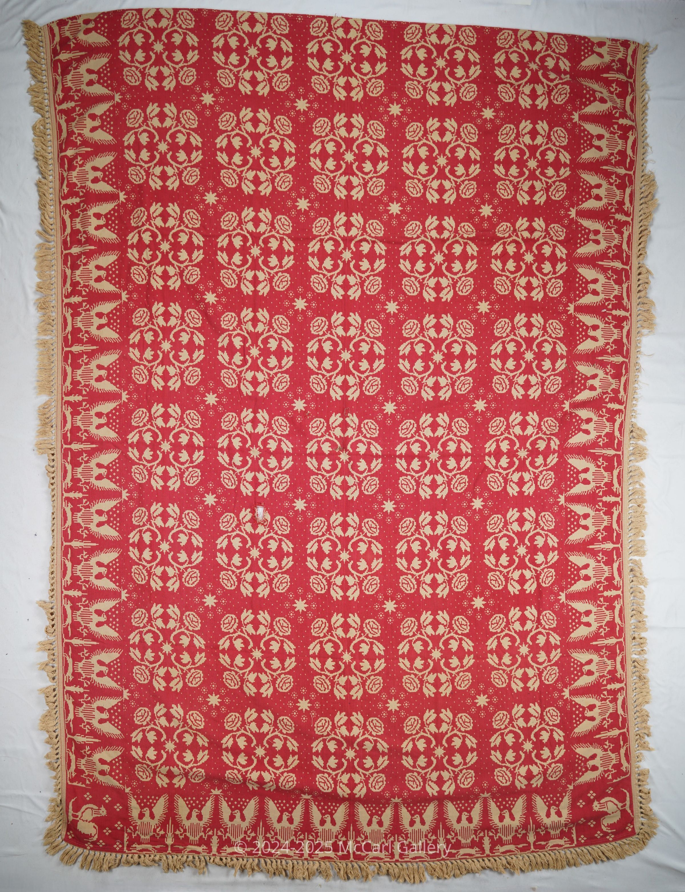 Natural and red figured double weave coverlet; seamless. Border and fringe on three sides. Historical reproduction coverlet by Bates. Newport Eagle line.Collection