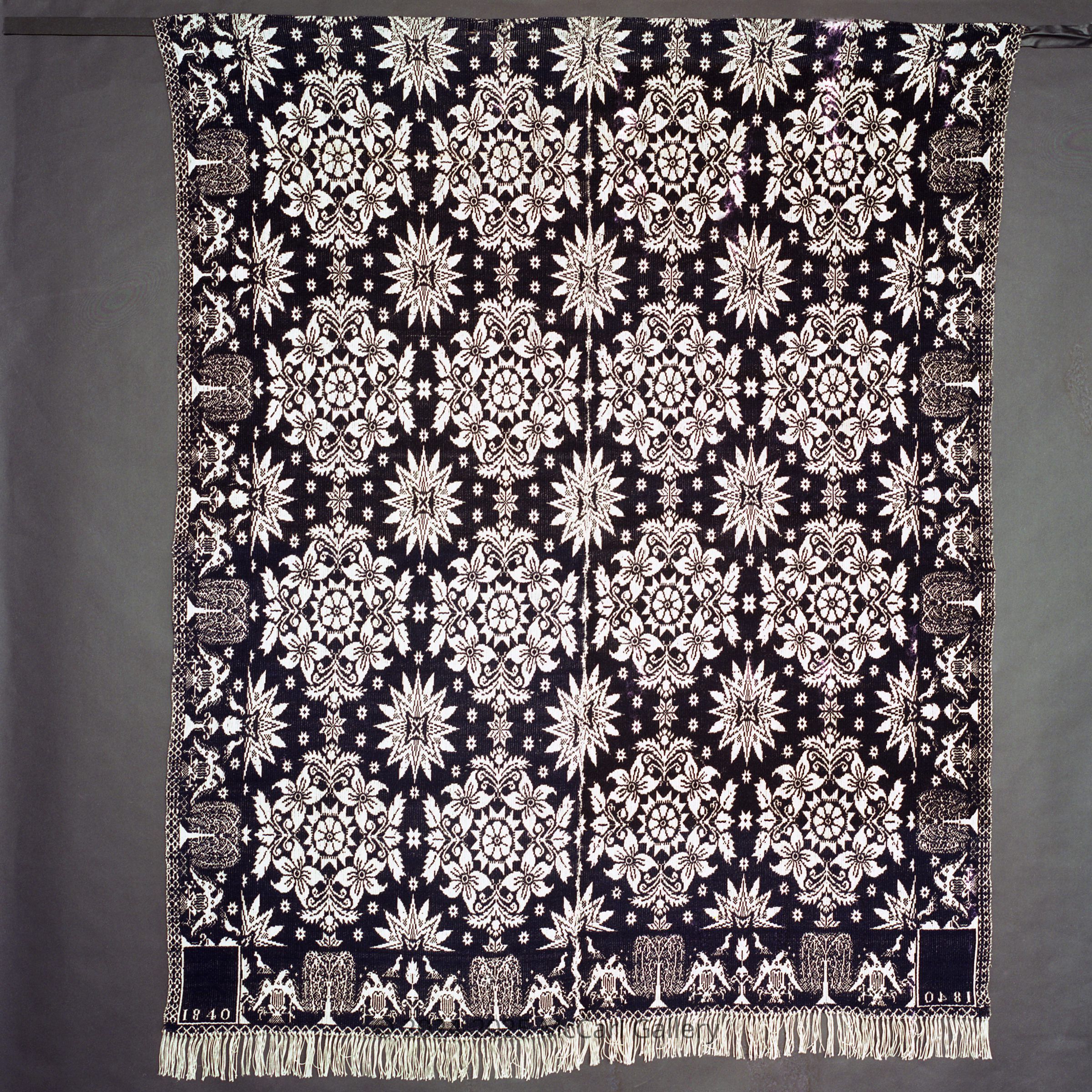 Beiderwand; navy, natural; two loom widths joined; fringe on bottom only; border of shielded eagles and willow trees on 3 sides; centerfield of stars and floral medallions; two corner blocksCollection