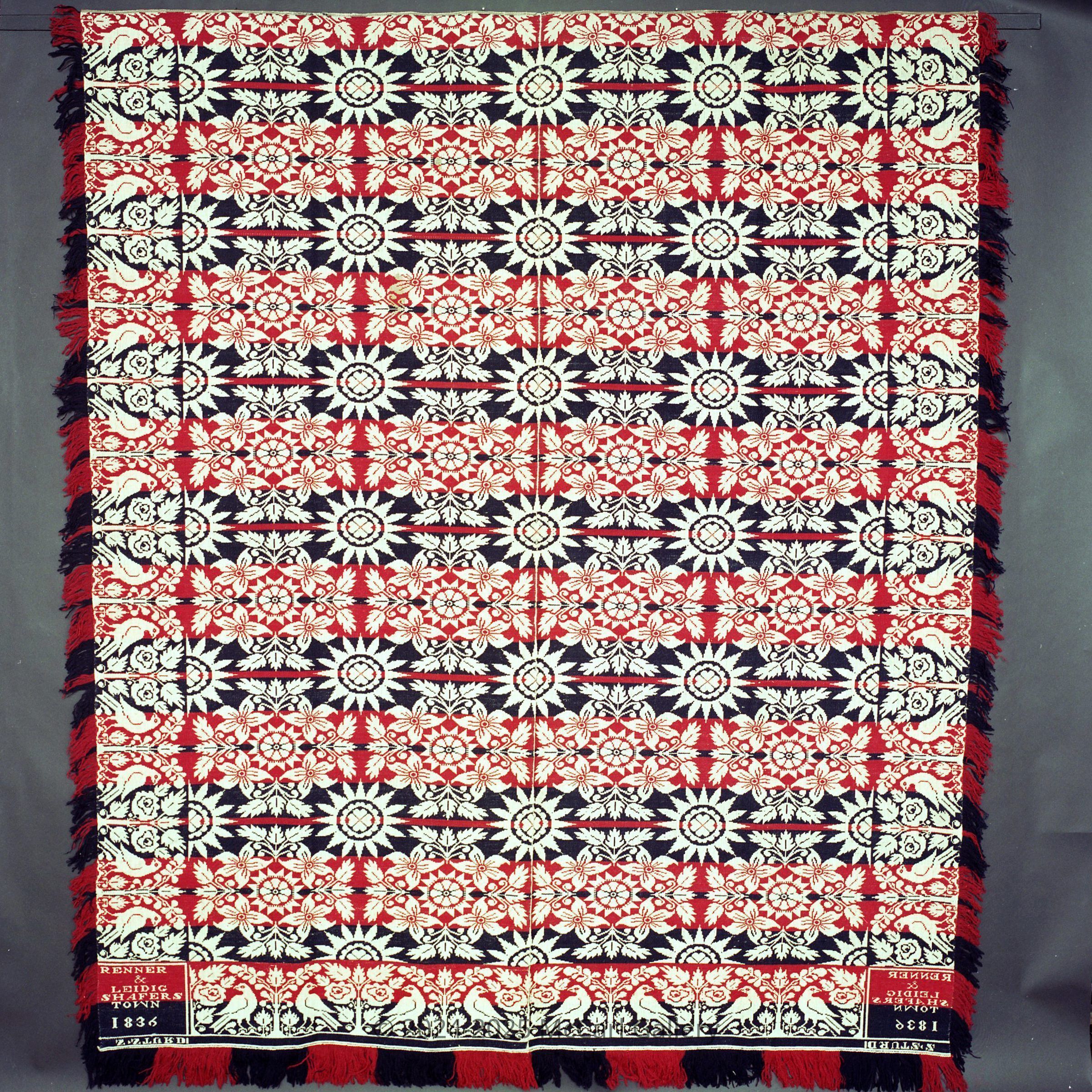 Beiderwand; navy, red, natural; two loom widths joined; fringe and border on 3 sides; border of birds, flowers, and leaves; centerfield of rows of floral and sunburst medallions; strips of color; two corner blocksCollection