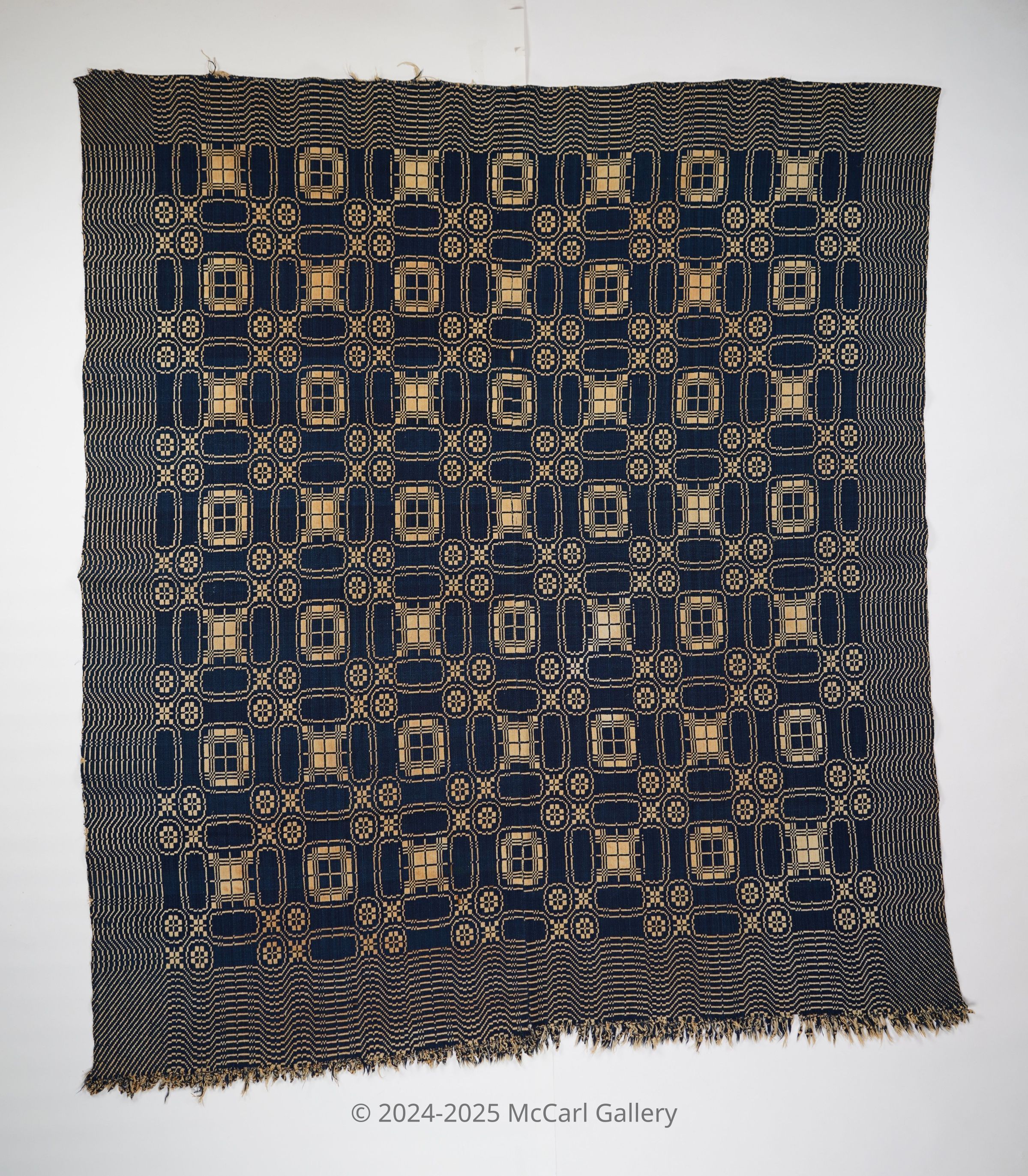 Navy and natural geometric double weave coverlet with border on four sides and knotted self-fringe along bottom. Two joined panels.Collection