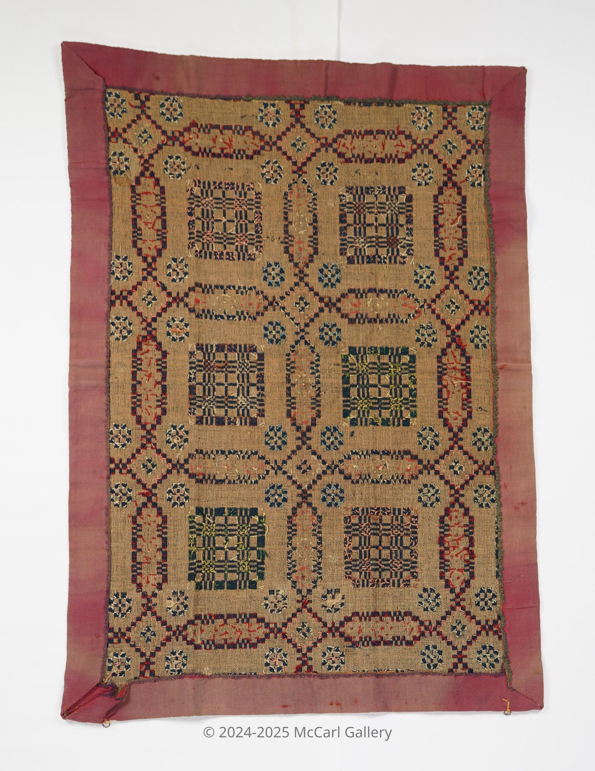 Red, navy, green, pink, yellow, and natural geometric coverlet. Navy and natural wove textile with red, pink, green, yellow, light blue, and natural embroidery/cross-stitching.Collection