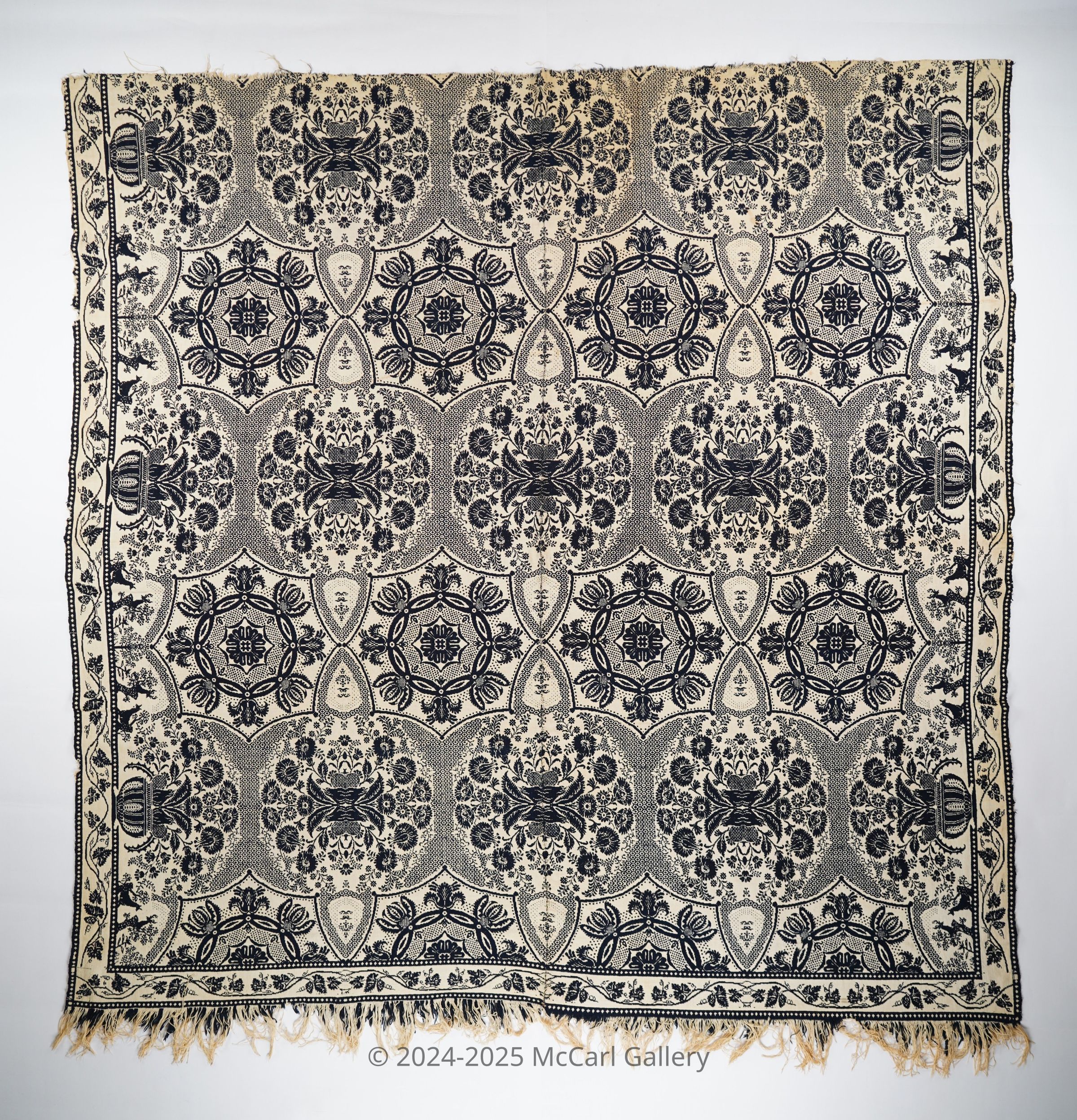Navy and natural figured doubleweave coverlet with border on three sides and self-fringe along bottom. Two joined panels.