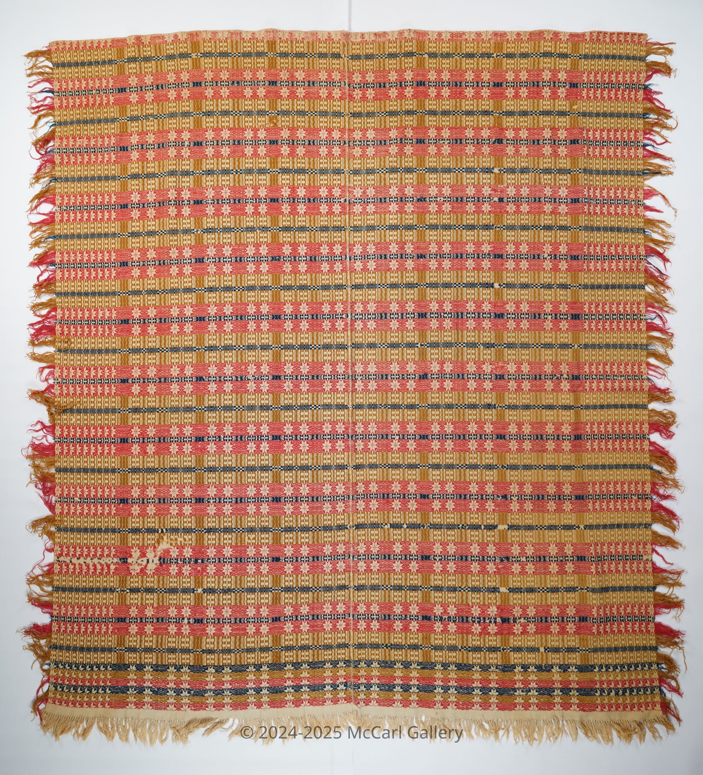 Red, burnt sienna, navy, and natural geometric coverlet with border and self-fringe on three sides. Two joined panels.Collection
