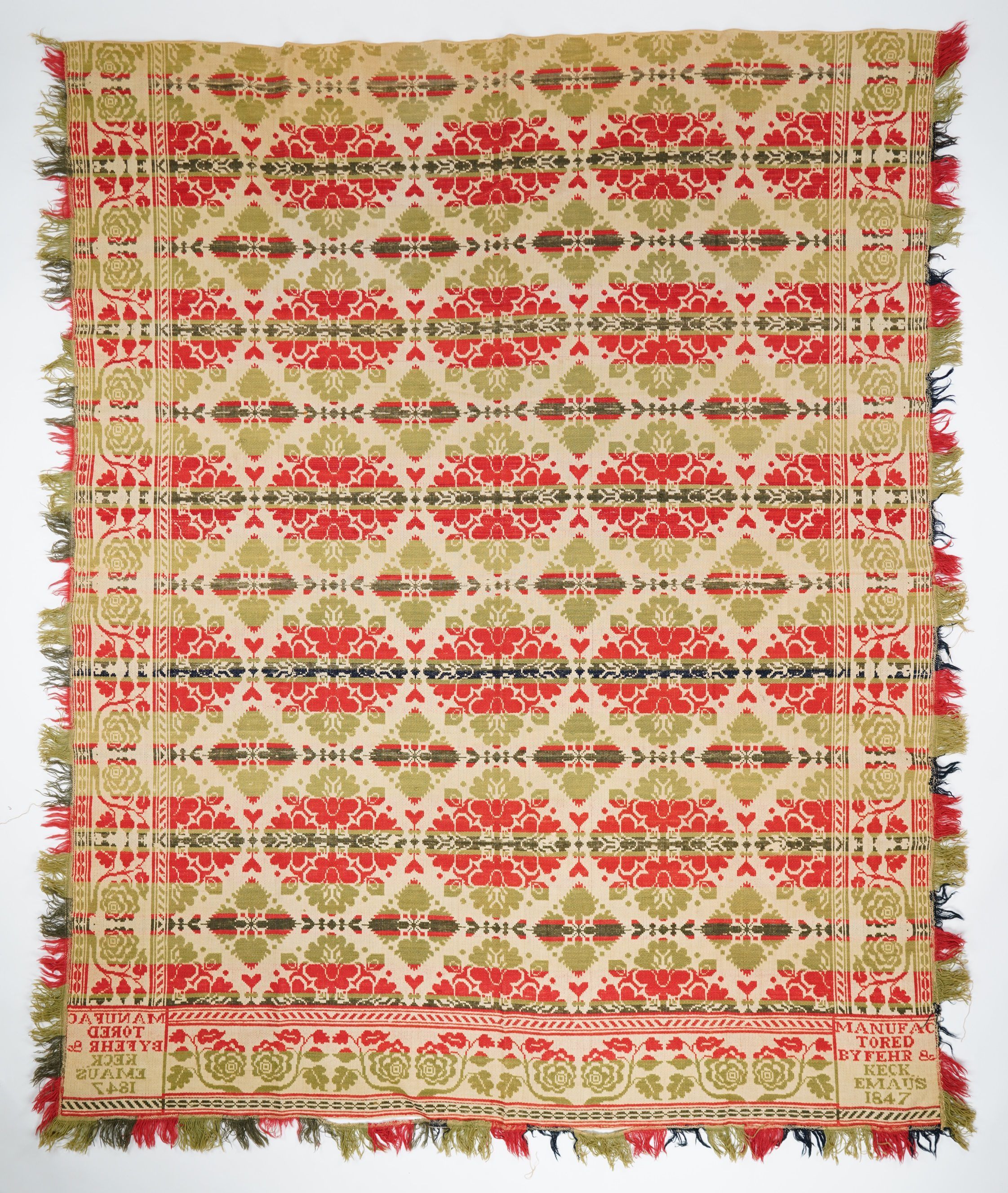 Red and multi-tone green figured tied Beiderwand coverlet; applied fringe on three sides; rose border on three sides; floral medallion centerfield pattern.
