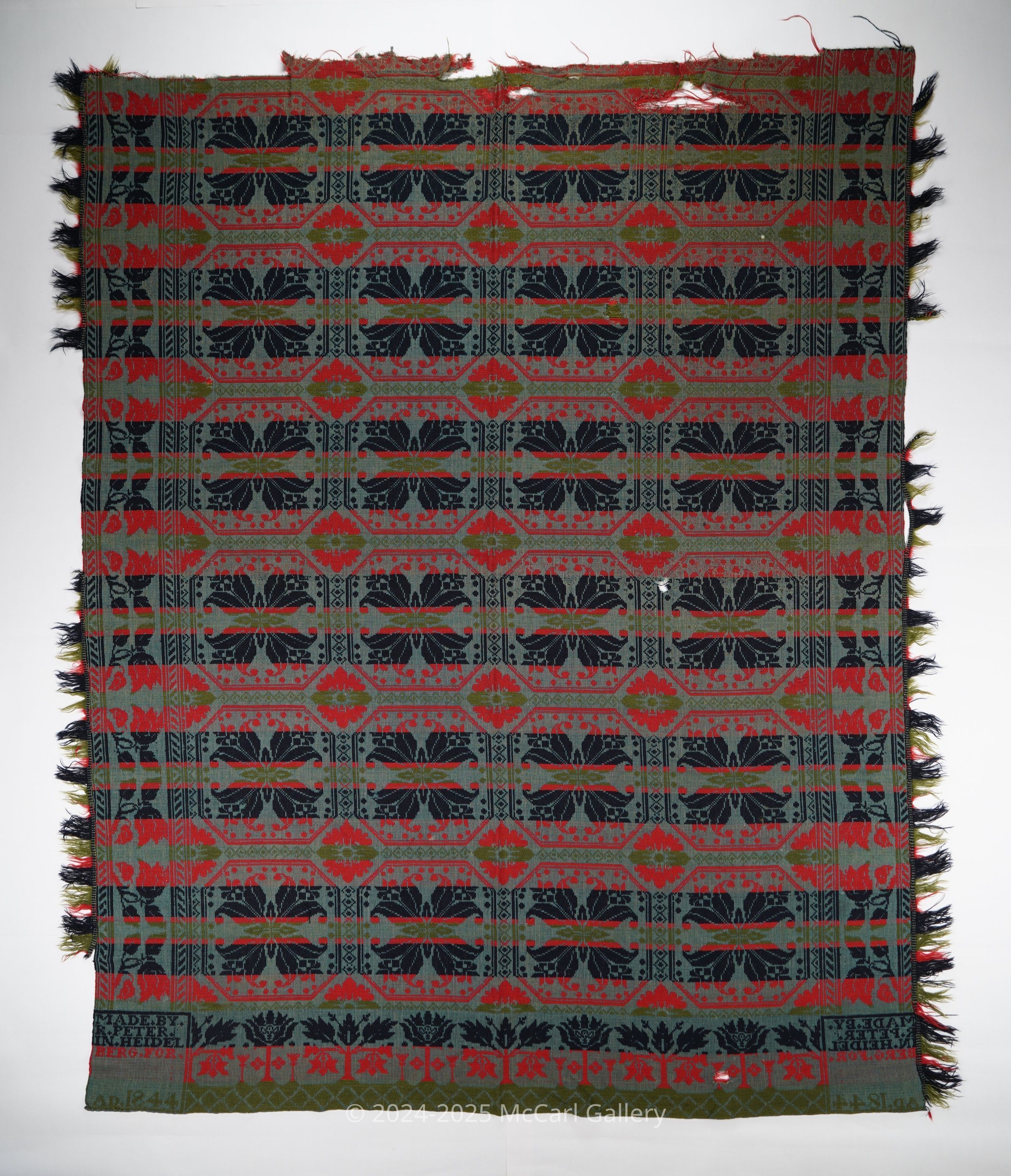 Blue, red, green. and navy figured tied beiderwand coverlet with border on three sides and self-fringe on two sides. Seamless. Woven by Reuben Peter in Heidelberg Twp., Lehigh Co., Pennsylvania in 1844.Collection