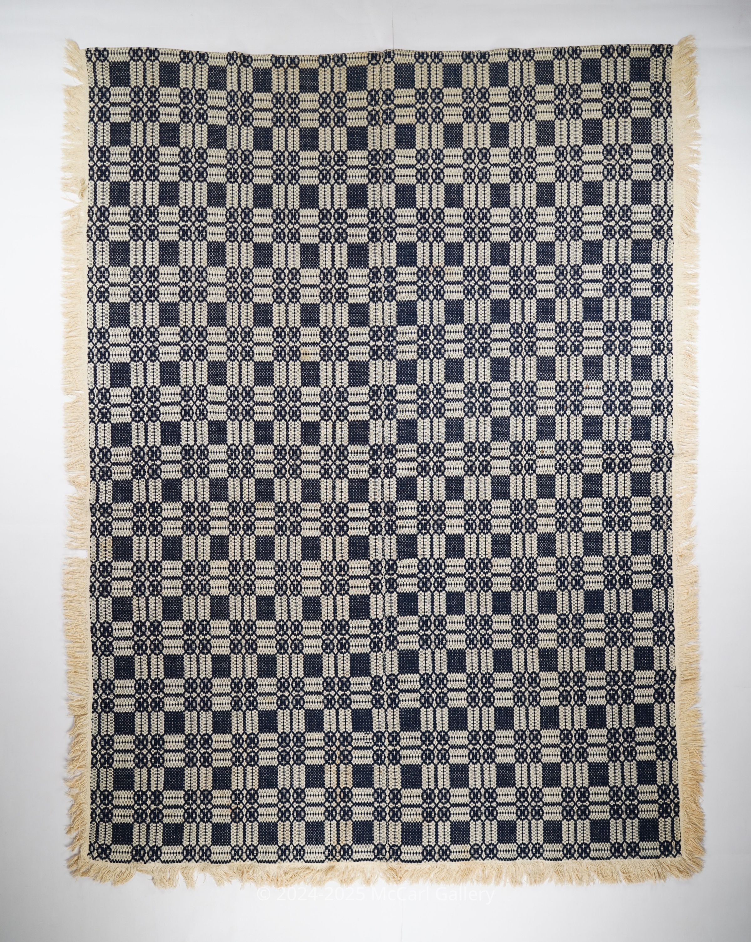 Geometric overshot coverlet with applied fringe on both sides and bottom. Two panels joined by a center seam. Navy wool with undyed cotton. Square and little circles centerfield pattern. Unknown weaver.Collection