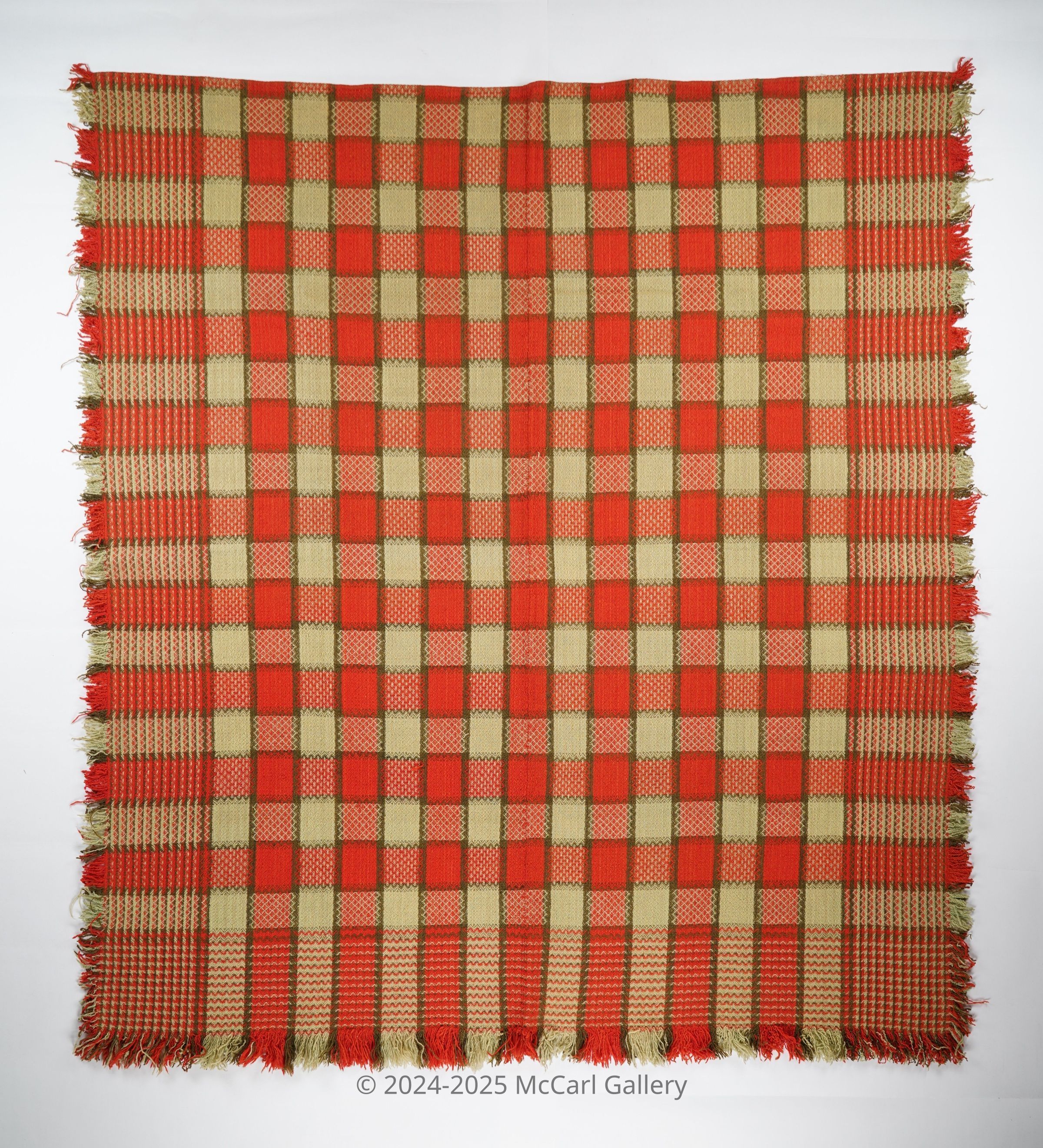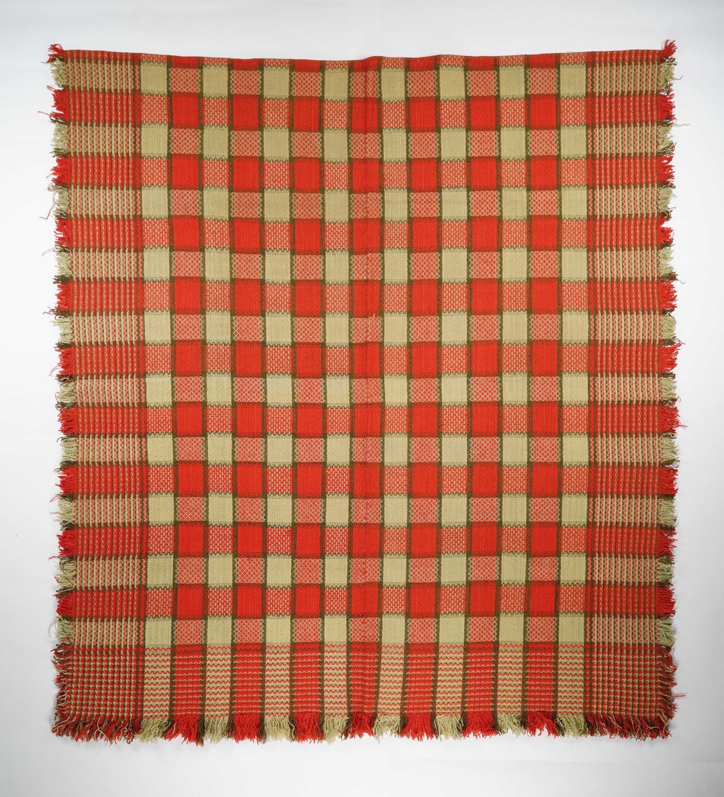 Red, green, and brown geometric point twill coverlet with border and self-fringe on three sides. Two joined panels.