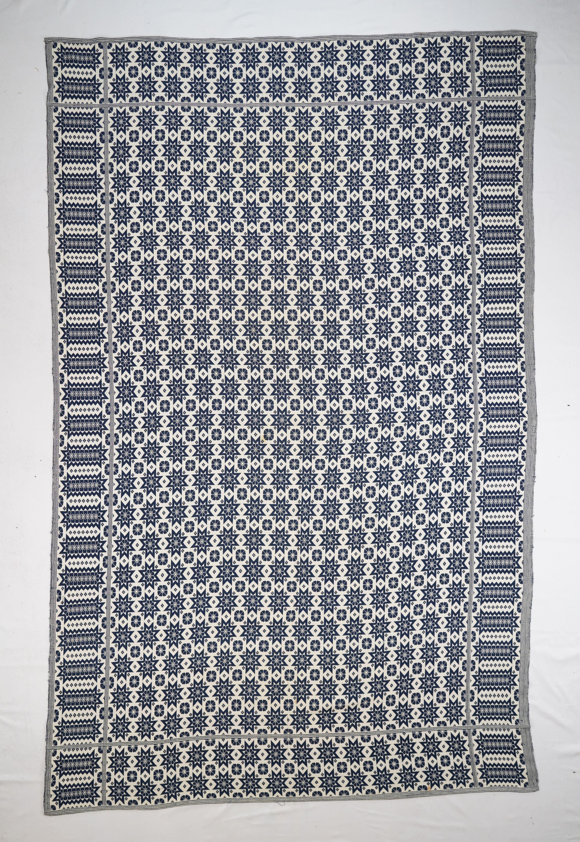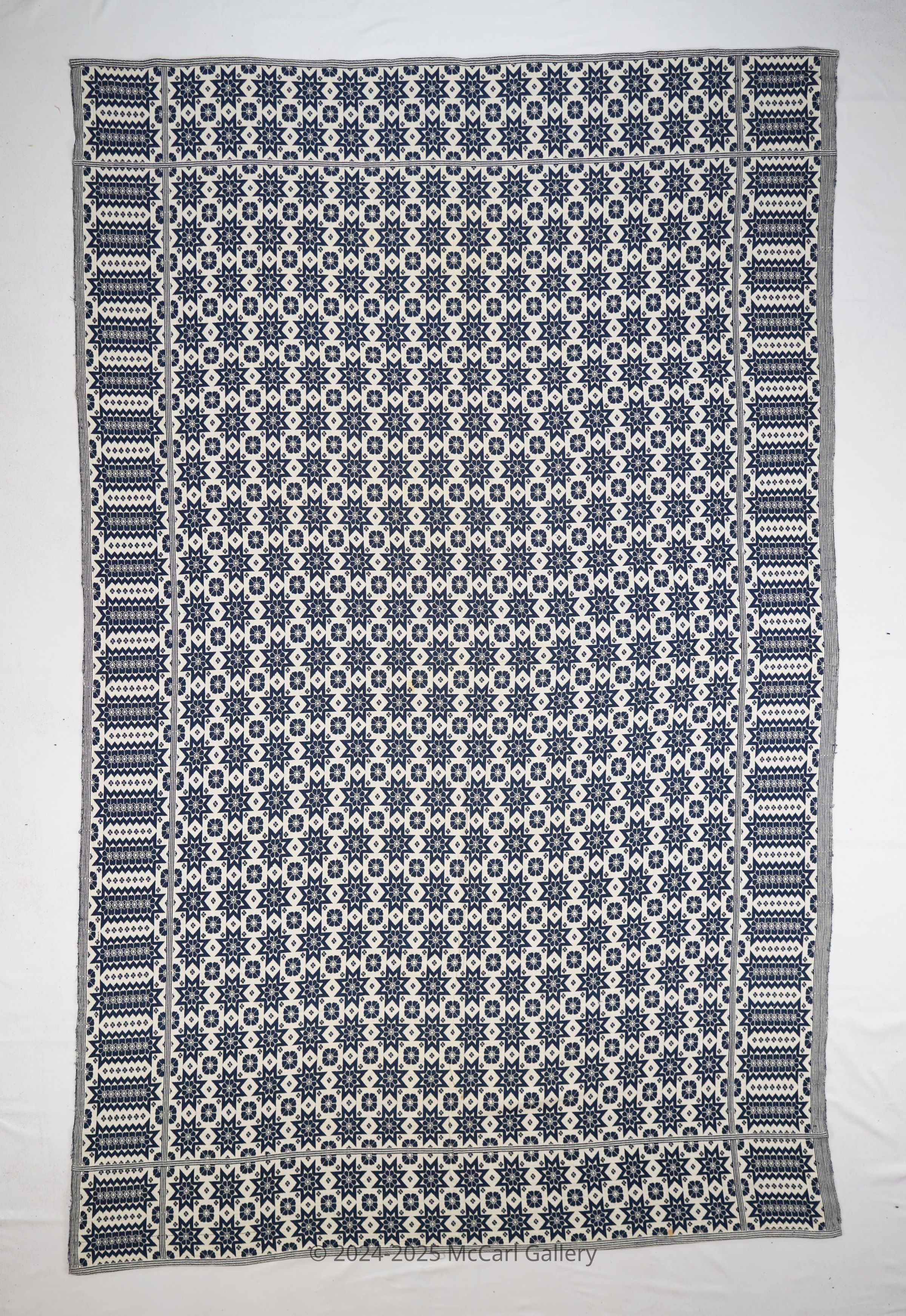 Natural and navy geometric Double weave coverlet; seamless. Border on four sides; no fringe.
