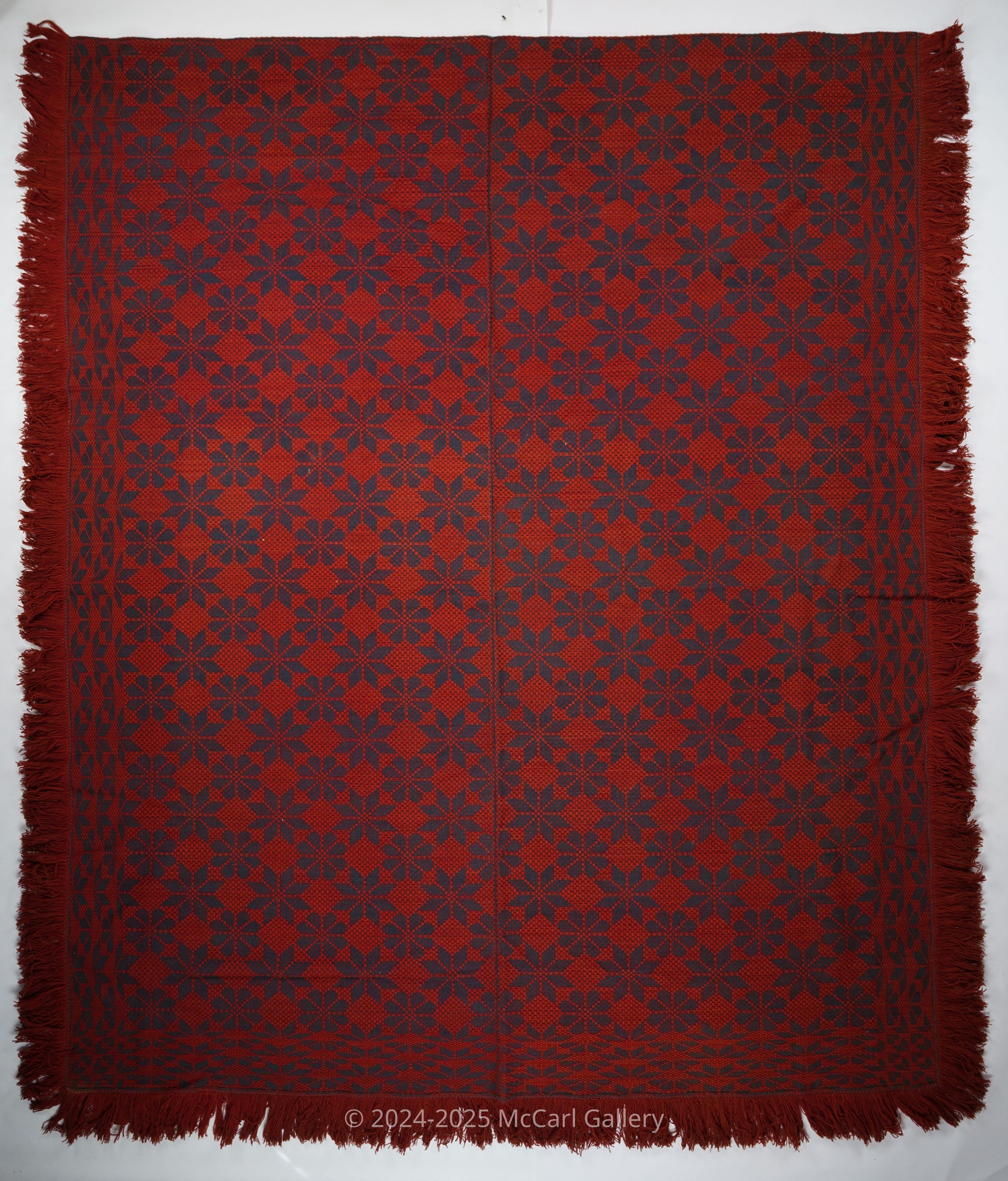 Red and navy geometric starwork coverlet with border and applied fringe on three sides. Two joined panels.