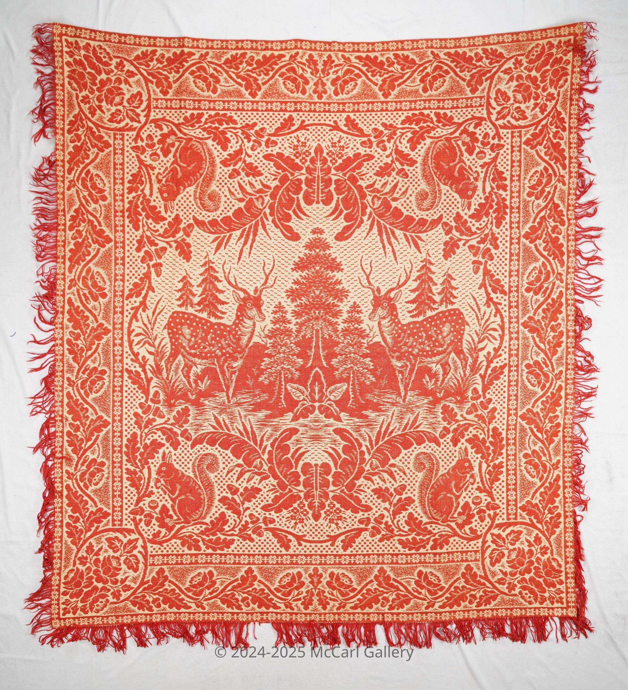 Natural and red figured double weave coverlet; seamless. Border on four sides; no fringe