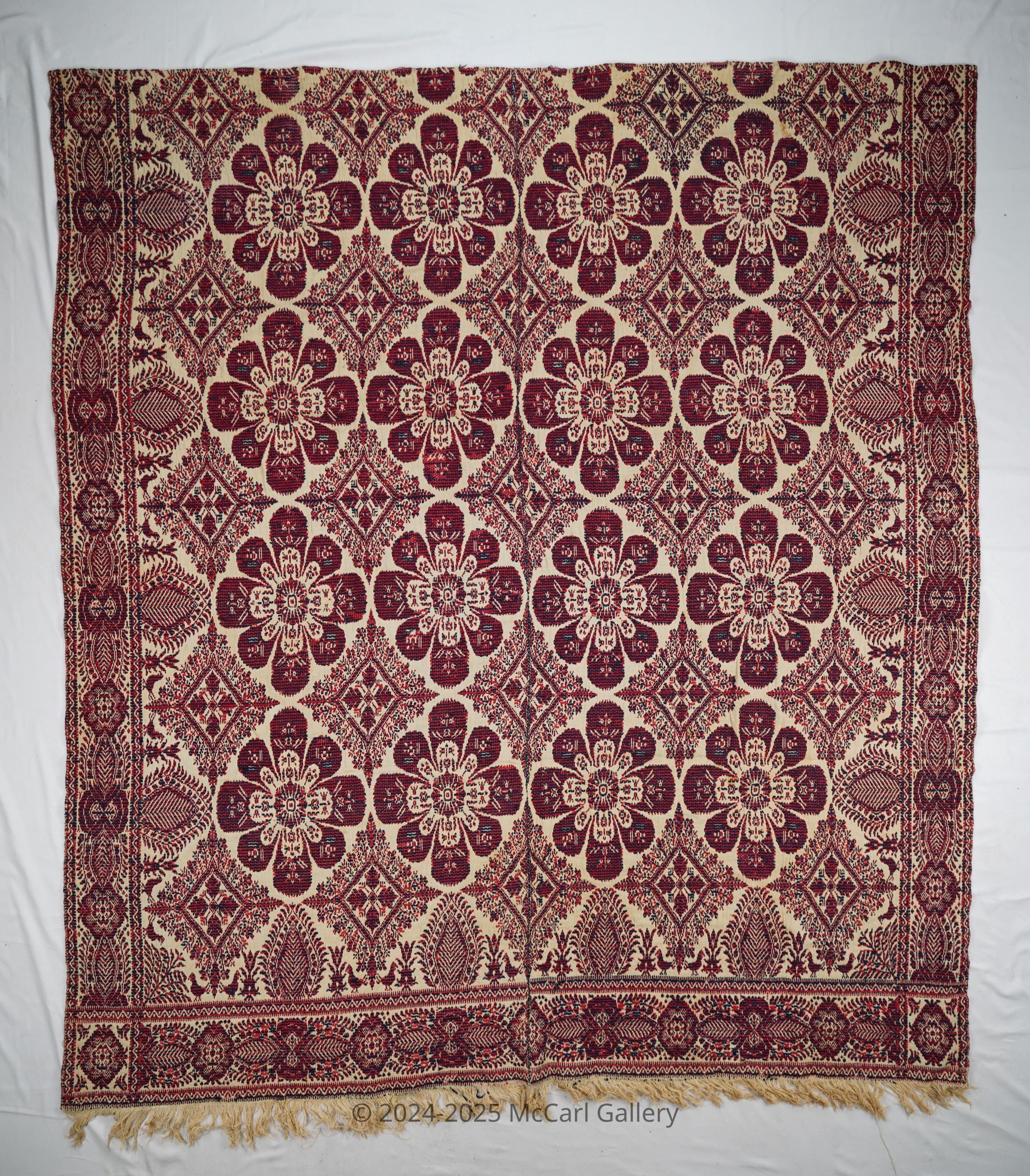 Natural, red, and navy figured true beiderwand coverlet; two panels joined by a center seam. Fringe on bottom; border on three sides.