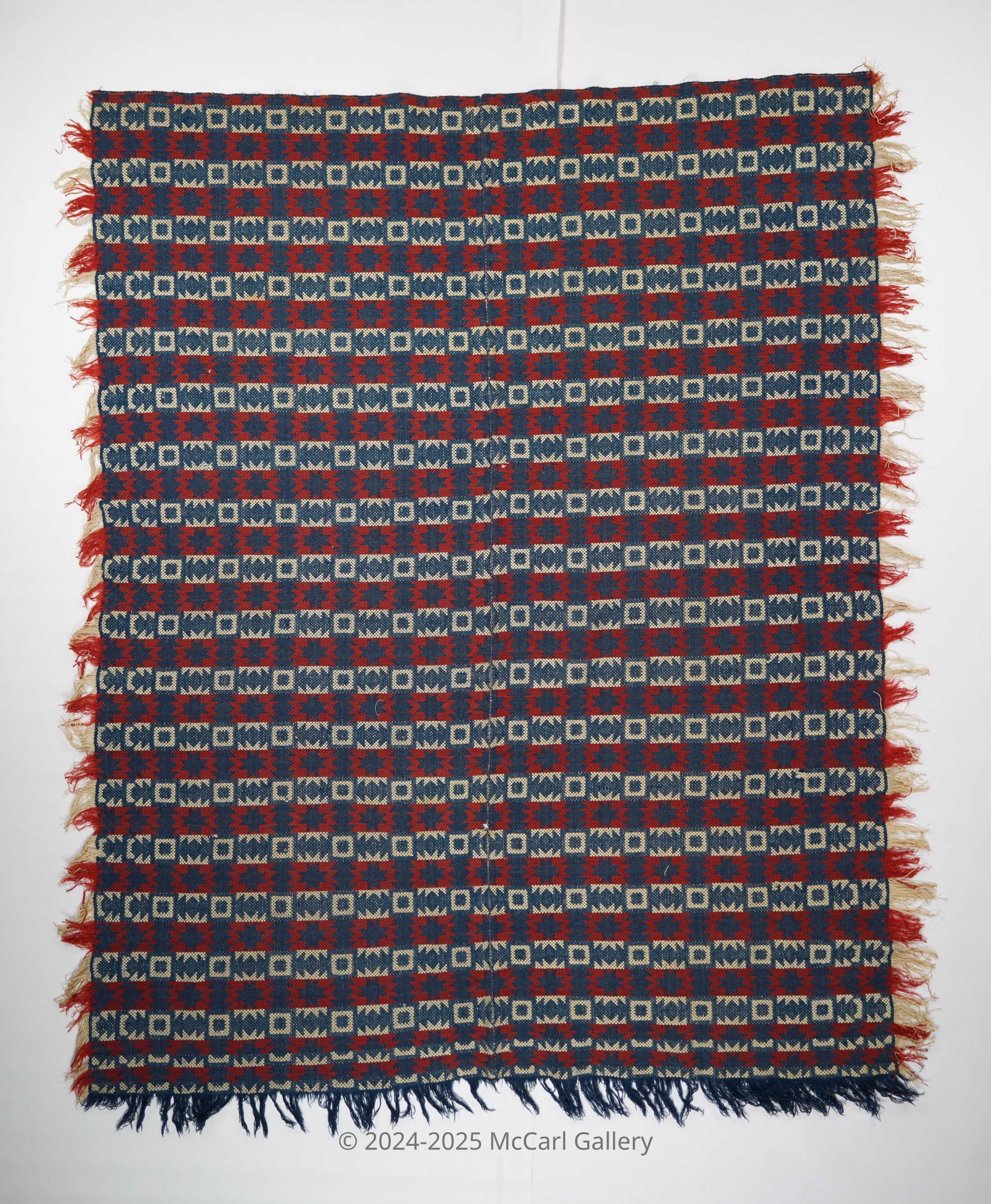 Red, navy, and natural geometric starwork coverlet with border and self-fringe on three sides. Two joined panels.