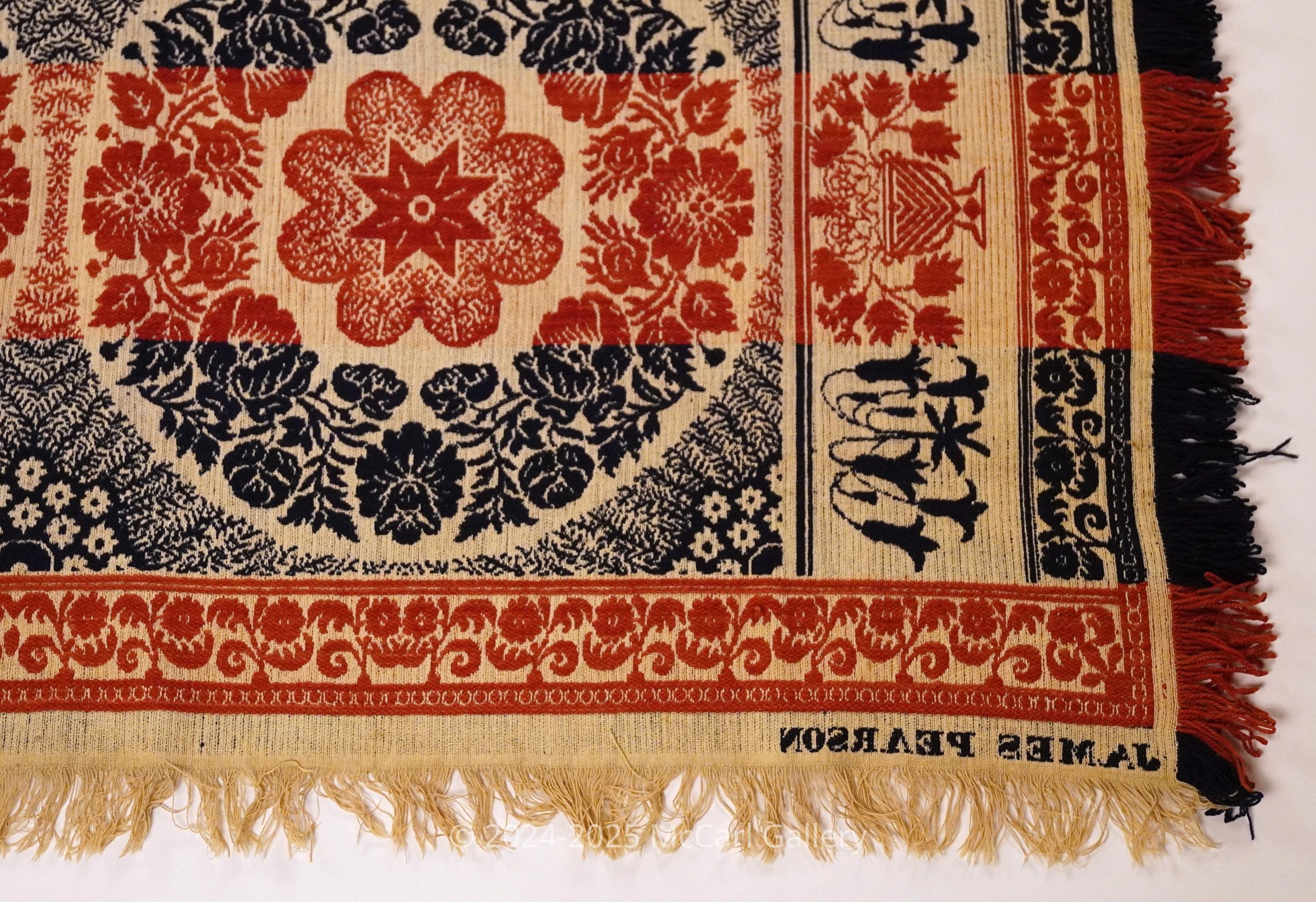 Navy, red, and natural figured tied beiderwand coverlet with self-fringe and flower border on three sides. Woven by James Pearson in Chippewa, Medina Co., Ohio.Collection