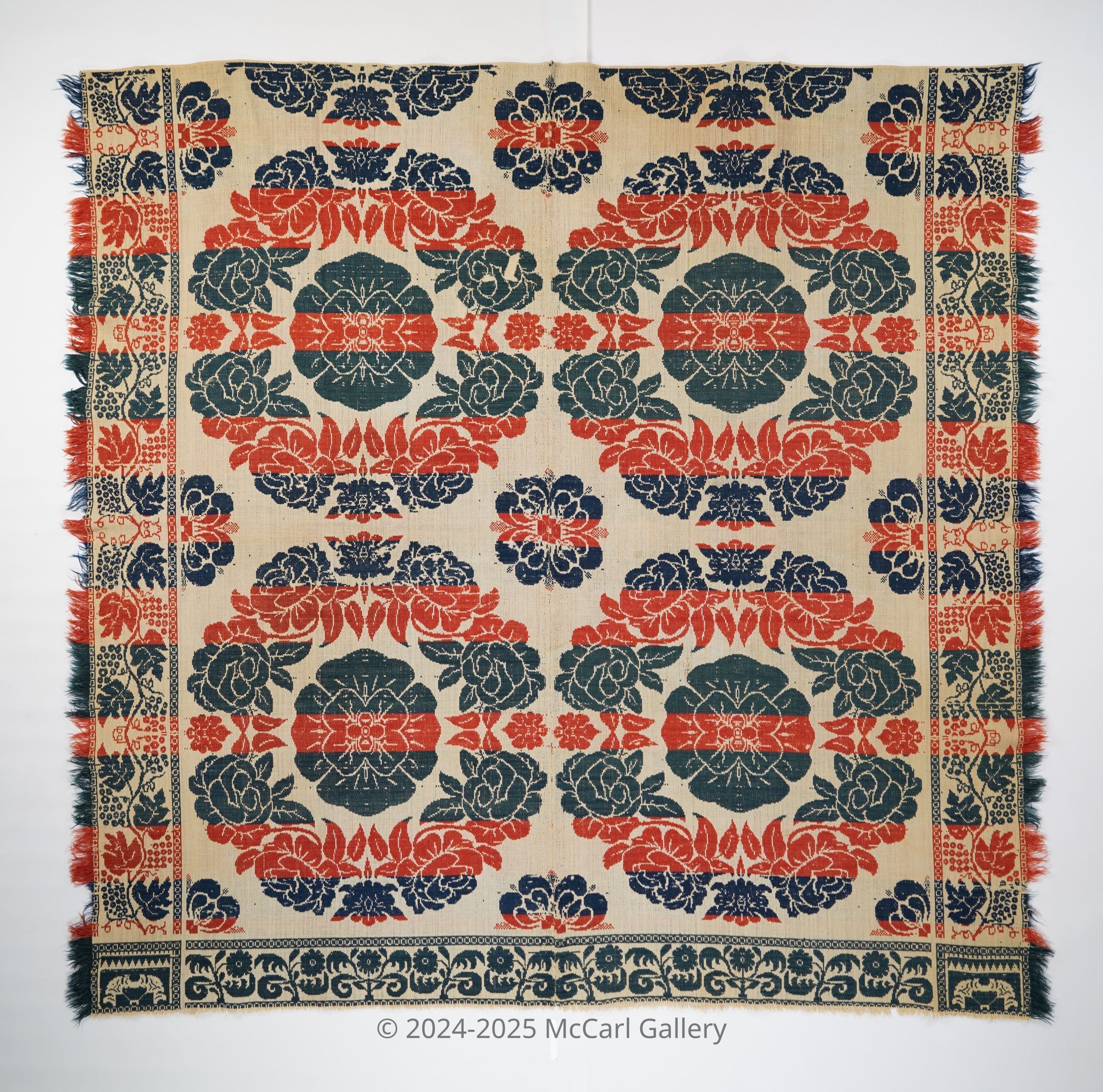 Blue/green, red, navy, and natural figured tied beiderwand coverlet with self-fringe on two sides and border on three sides. Two joined panels.Collection