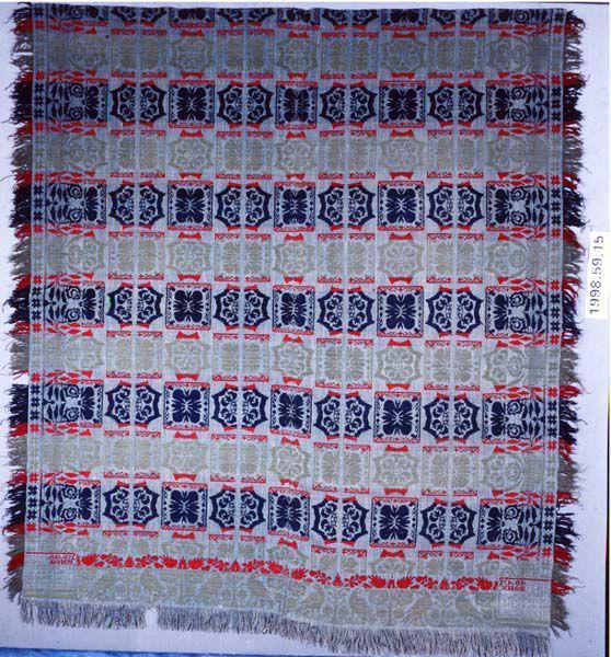 Figured coverlet; blue cotton and blue, red, and green wool, tied double cloth (Beiderwand). Center seam joins two panels. Hemmed top, fringed sides and bottom. Central motif consists of alternating rectangular and scalloped medallions filled with stylized floral designs. The coverlet is woven in alternating bands of green and blue with each band being bordered by a narrow band of red. Side borders contain a rose and leaf motif, while the bottom border shows facing birds with a stylized tree in between. A narrow secondary border of eight-pointed stars is on each side.Collection