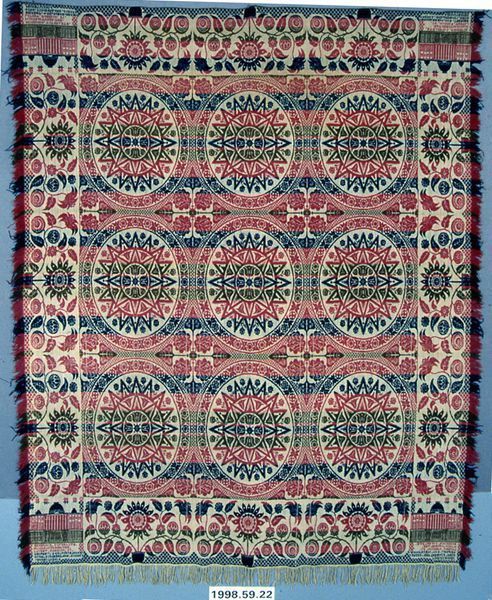 Figured coverlet; undyed and blue cotton and rose, blue, and olive wool, tied double cloth (Beiderwand). Top edge is hemmed, sides and bottom are fringed. Central motif consists of medallions in an elliptical starburst design. At the center of each starburst is a tulip motif with rose/tulip design framing the starbursts. Separating the rows of starbursts are diamond shaped medallions of four roses with a spade shaped leaf pointing in all four directions. Each side has a border containing three sunflower-like flowers in a pot with leaves and stylized flowers branching to either side of the pot. In each corner block there is a domed building and woven text.Collection