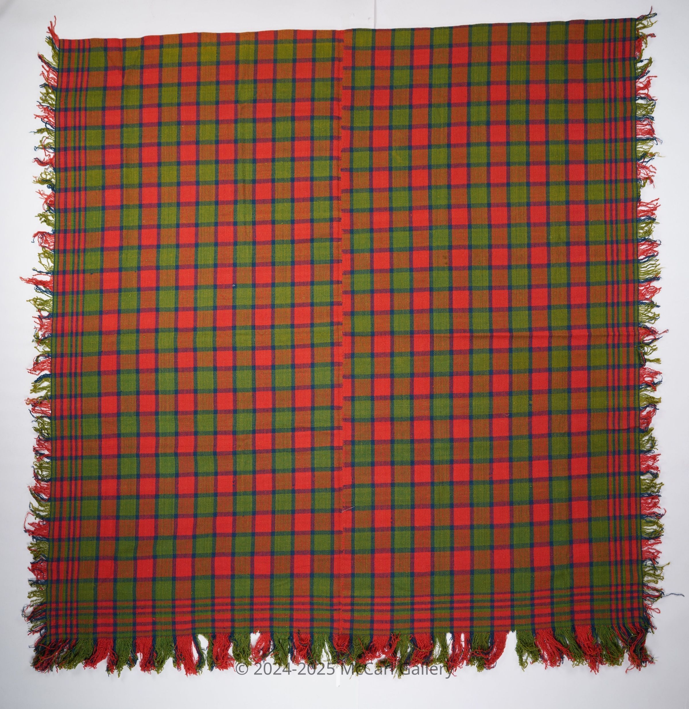 Green, navy, and red geometric twill coverlet with border and self-fringe on three sides. Two joined panels.