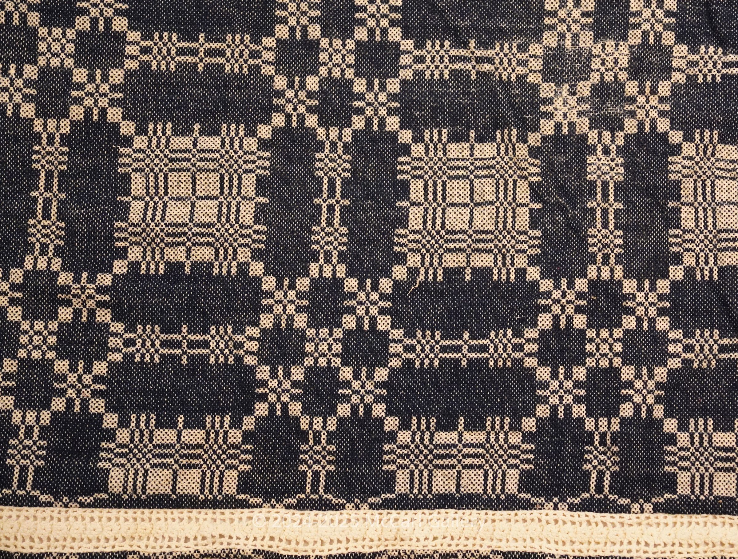 Natural and navy geometric summer and winter coverlet; two panels joined by a center seam. No fringe; border on three sides.