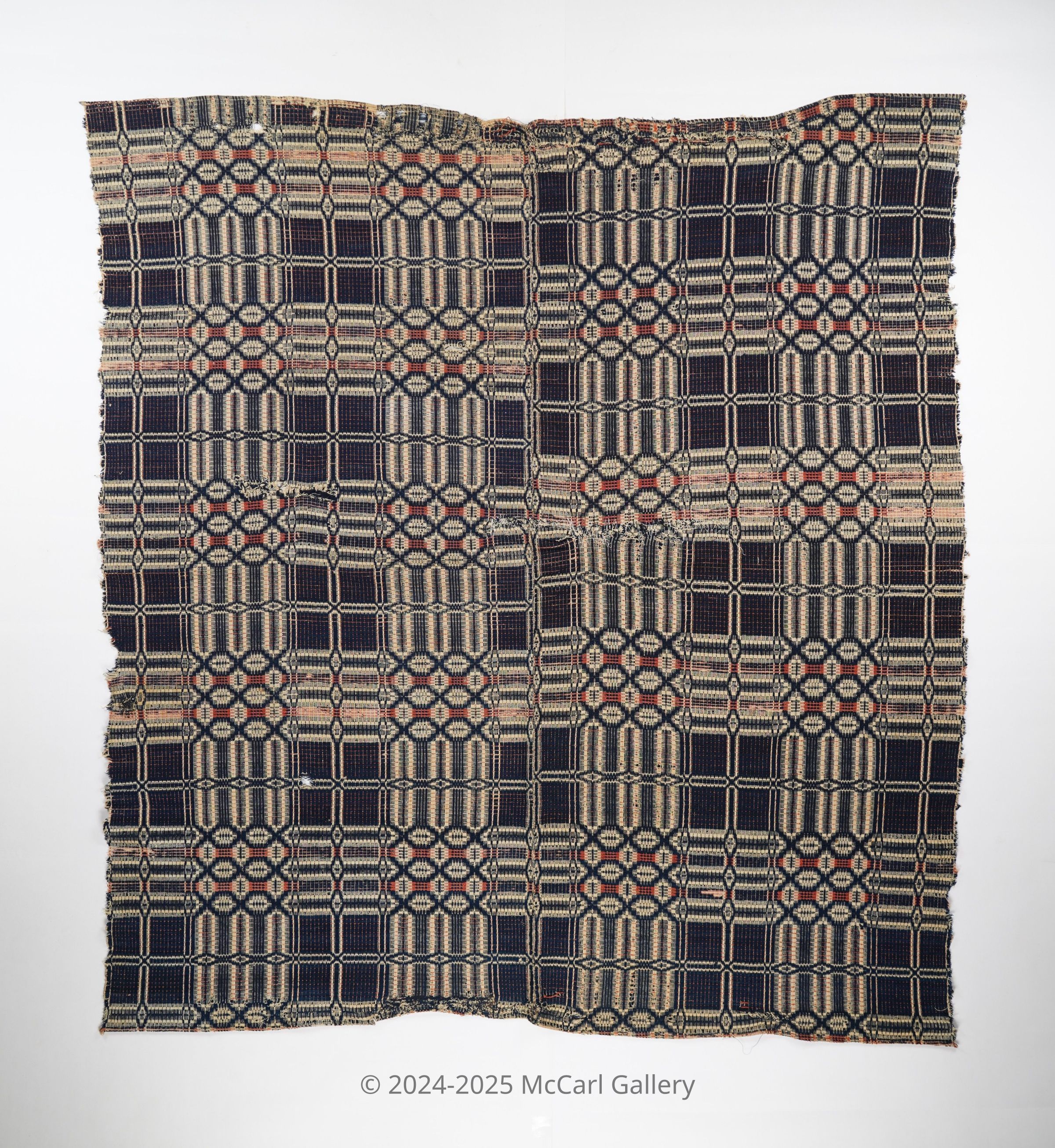 Geometric overshot coverlet with no fringe. Two panels joined by a center seam. Navy and red wool with undyed cotton. Abstract centerfield pattern. Unknown weaver.Collection