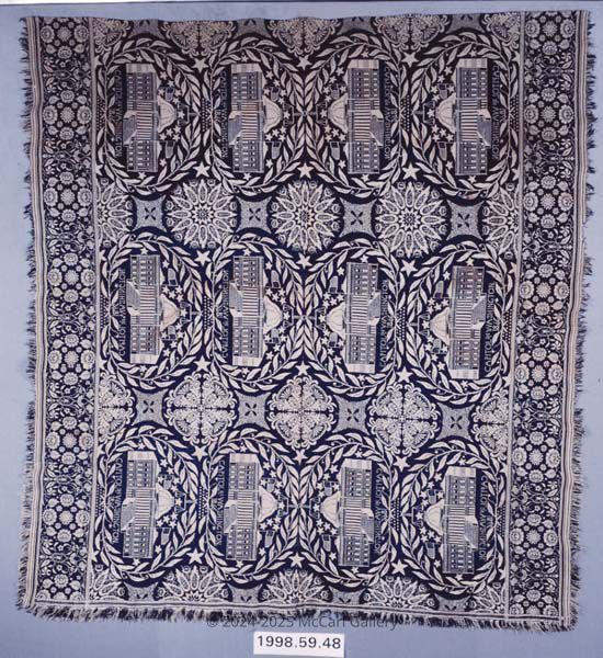 Figured coverlet; undyed cotton and blue wool, double cloth. Center seam joins two panels. Hemmed top, fringed sides and bottom. Central motif is a modified representation of the capitol building in Washington D.C. with two flags flying on either side of the dome, stars surrounding the dome, and the scales of justice atop the dome. This motif is repeated throughout the coverlet. The depiction is encircled with a wreath of laurel. Between the capitol building are two circular designs, one of a four part floral design and the second a stylized leaf design with a star burst center. Borders on each side contain circular rose patterns with starburst centers.Collection