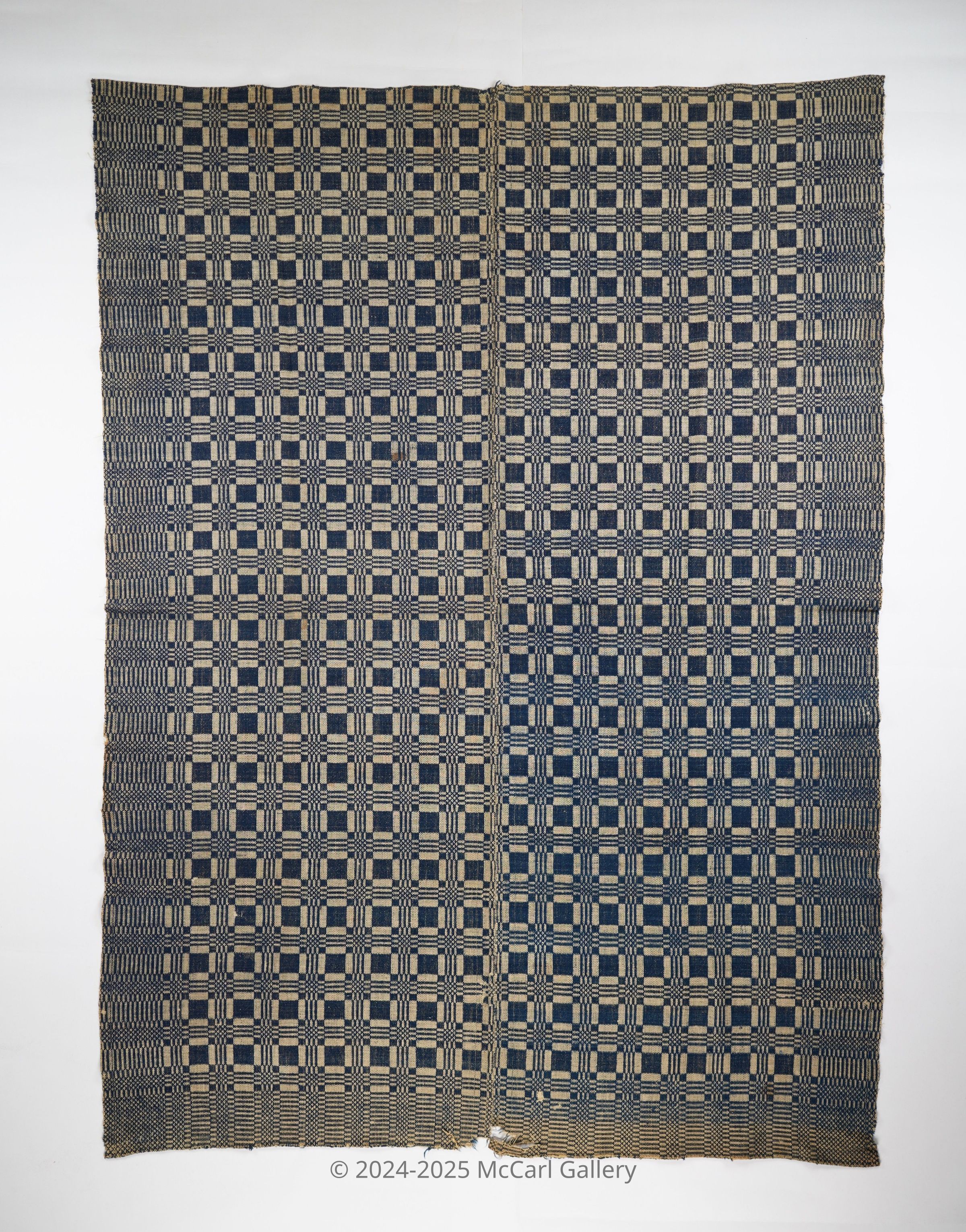 Navy and natural geometric summer & winter coverlet with border on three sides. Two joined panels.