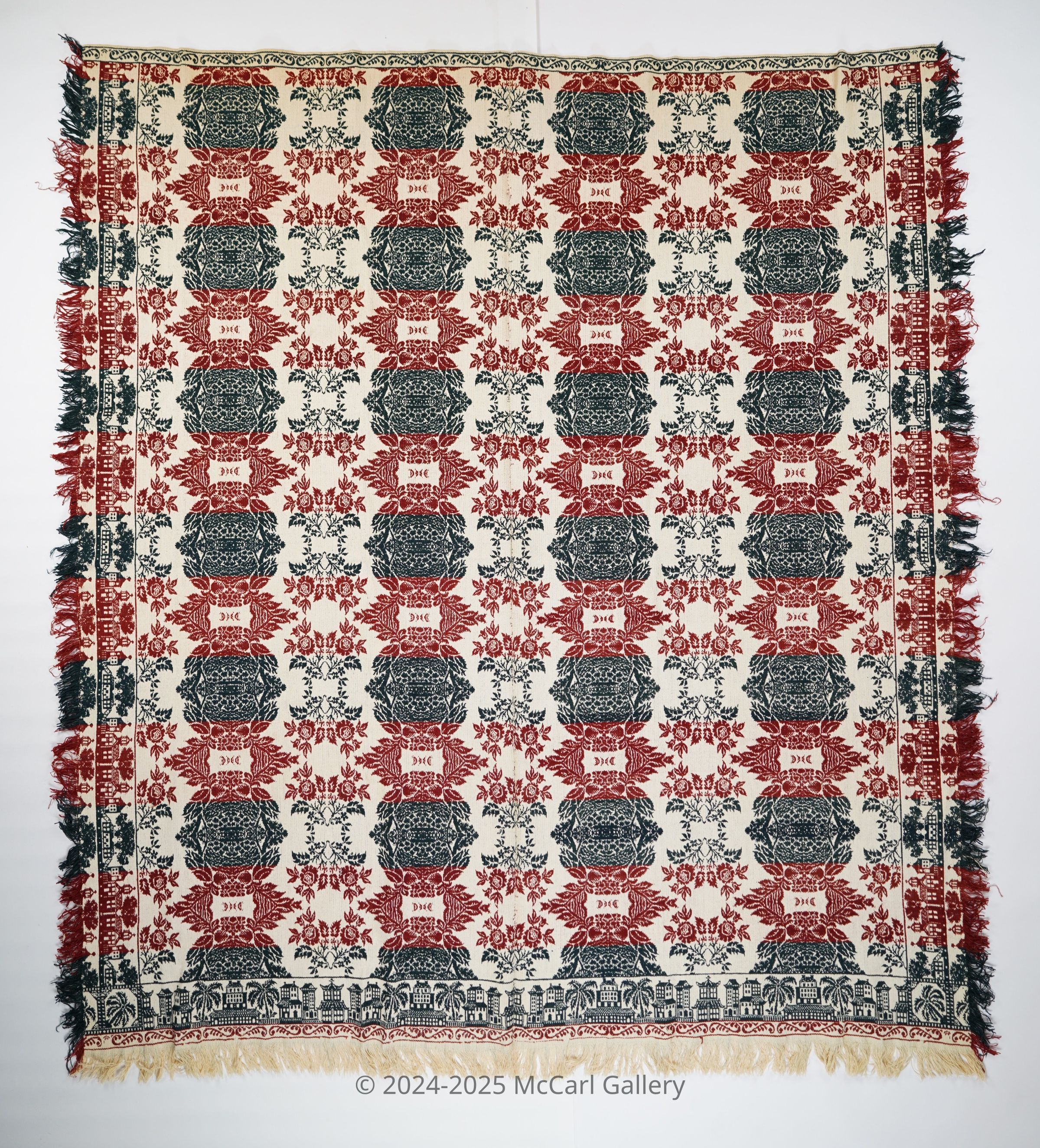 Navy, red, and natural figured tied beiderwand coverlet with border and self-fringe on four sides. Two joined panels. The cornerblocks feature a palm tree trademarkCollection