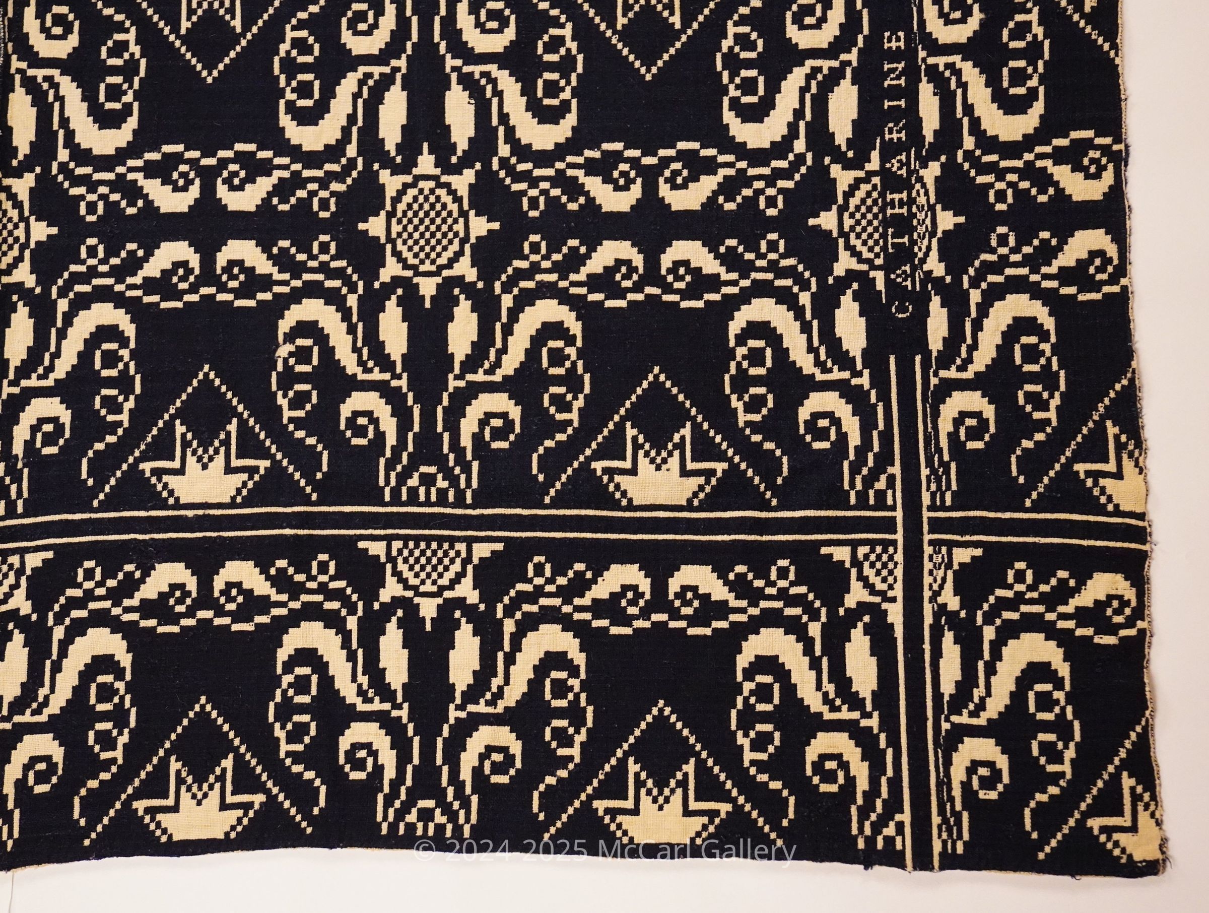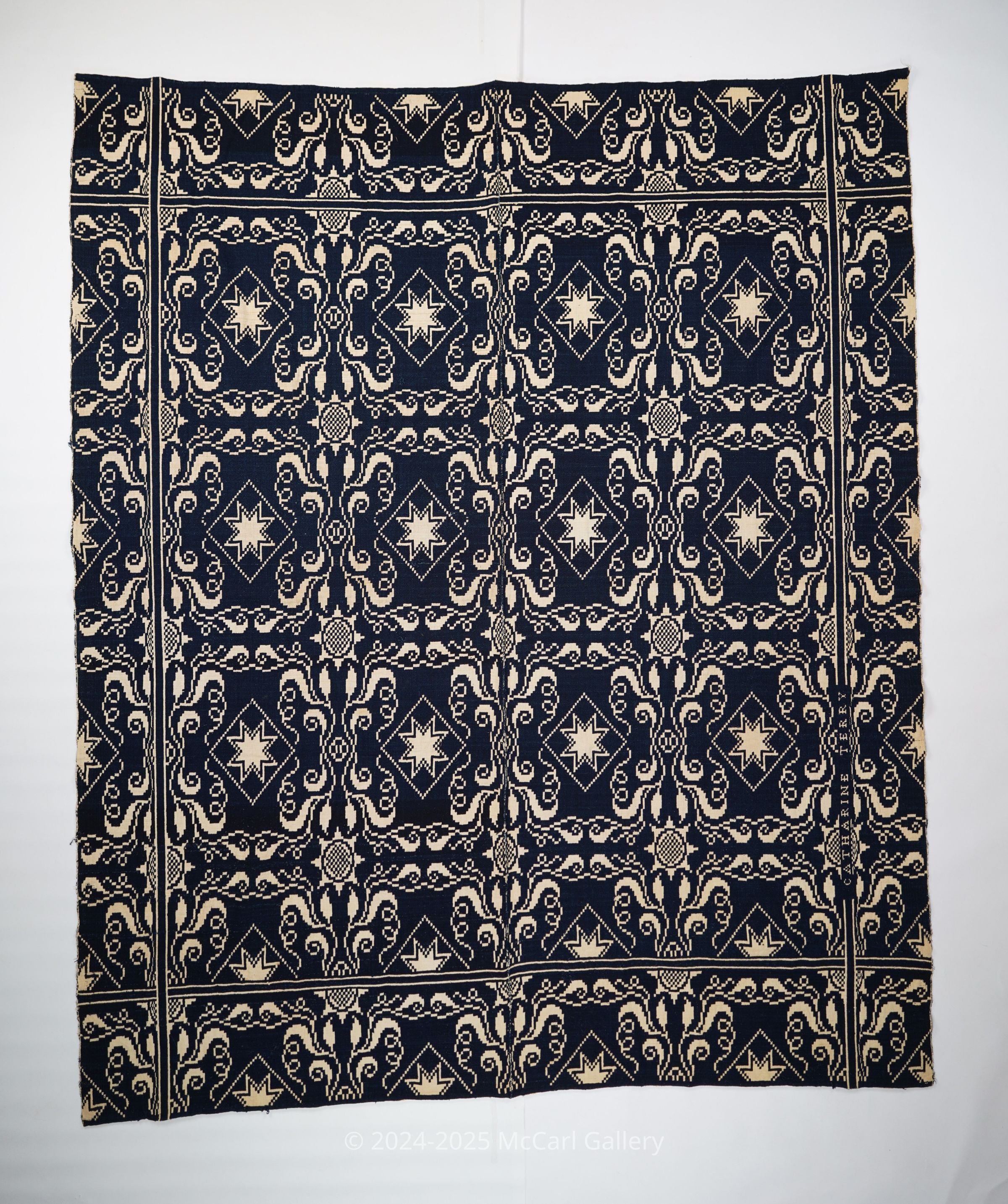 Navy and natural figured double weave coverlet with border on four sides. Two joined panels. Woven for Catharine Terry.Collection