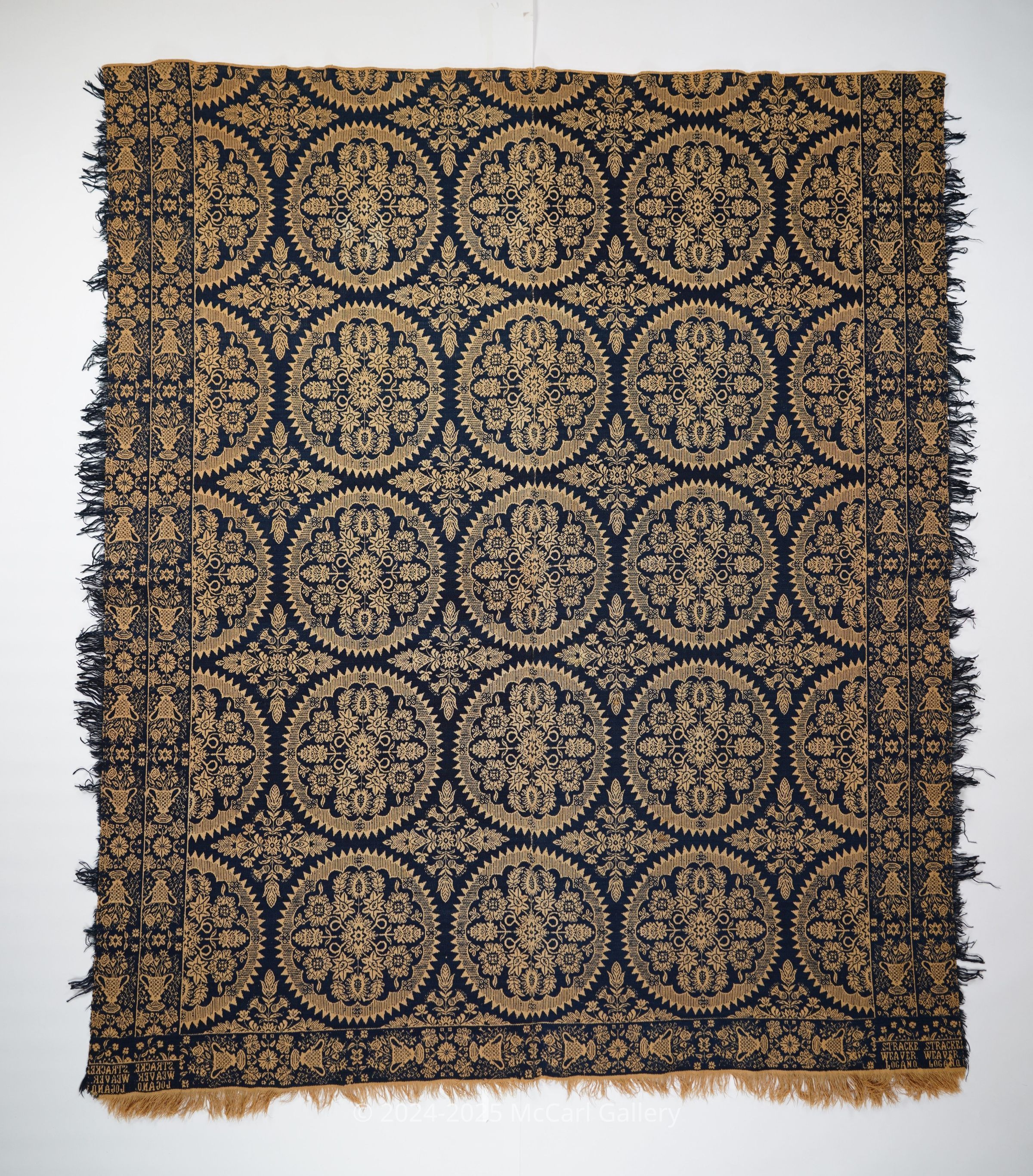 Navy and natural figured tied beiderwand coverlet with border and self-fringe on three sides. Seamless. Woven by Barnhardt Stracke in Logan, Hocking Co., OhioCollection