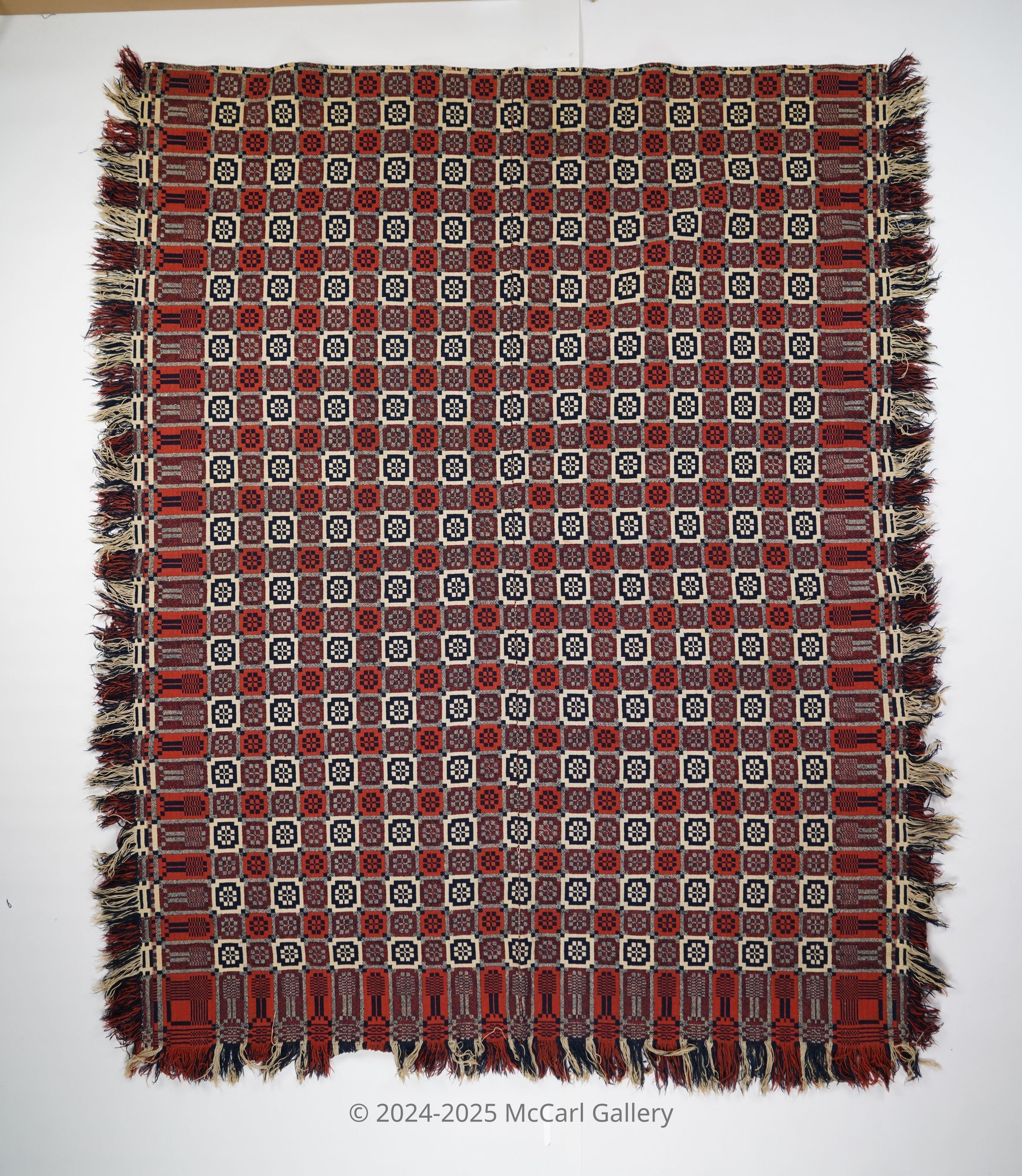 Red, natural, and navy geometric double weave coverlet with border and self-fringe along three sides. Two joined panels.Collection