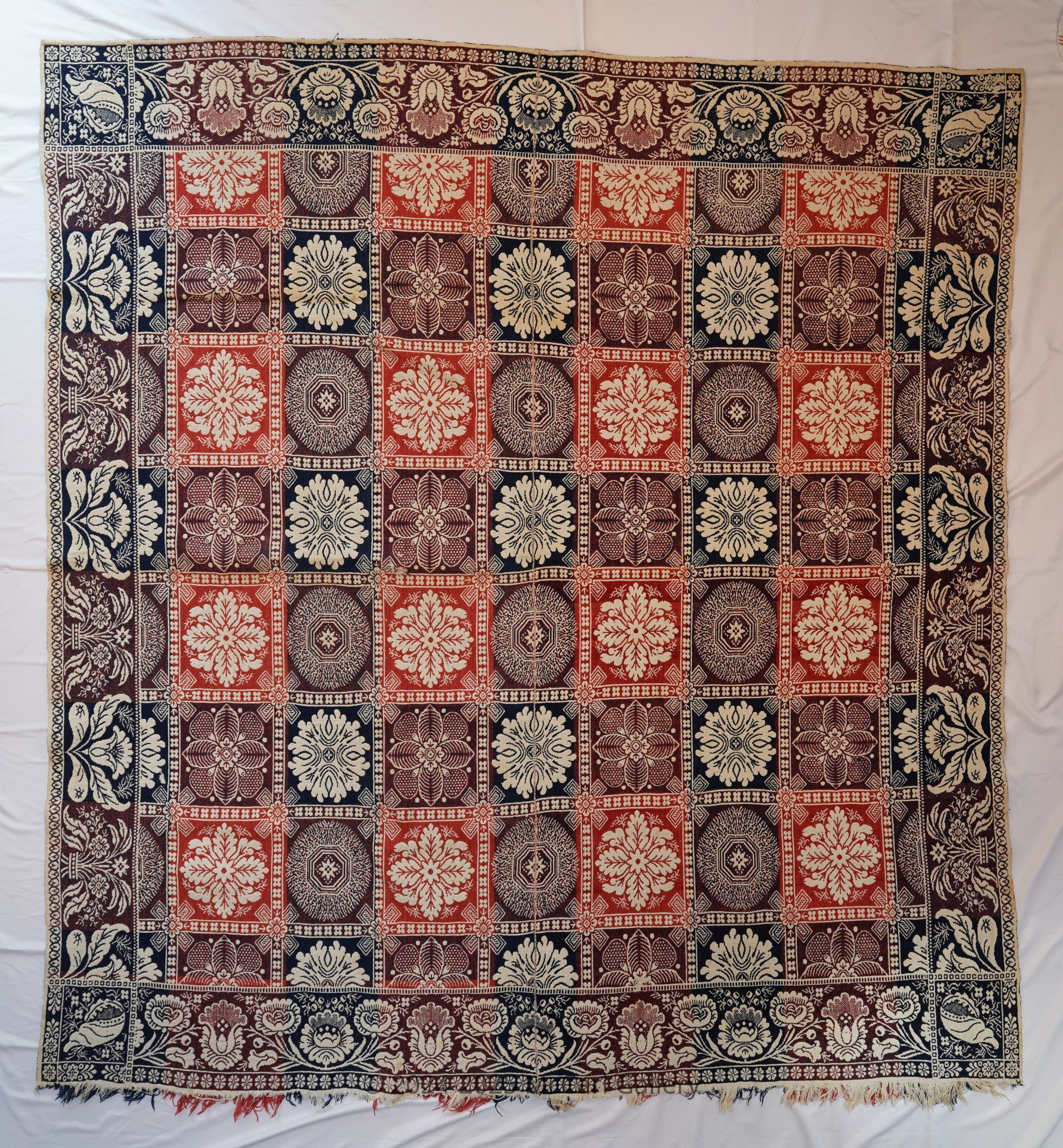 Natural, navy, purple, and red figured double weaver coverlet; two panels joined by a center seam. Border on four sides, fringe on bottom.Collection
