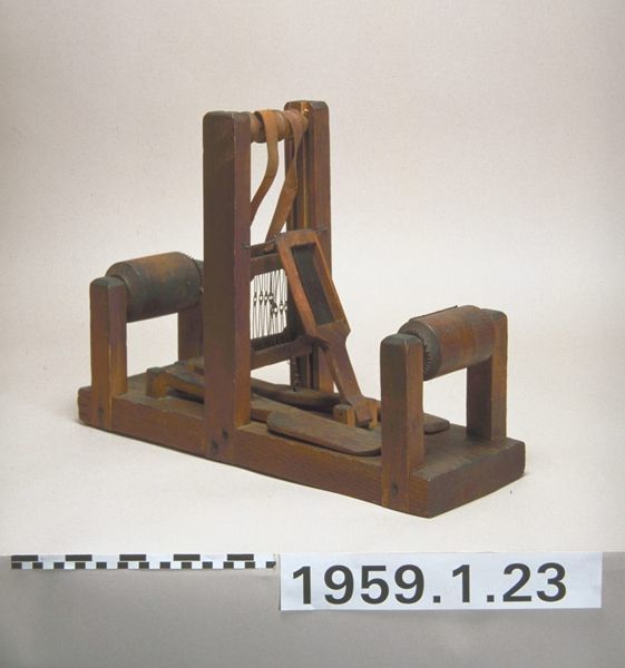 Loom, table, tape, 2 harness and beater. See accession filed for detailed description. Heavy base and posts, paddle- shaped beater.Collection