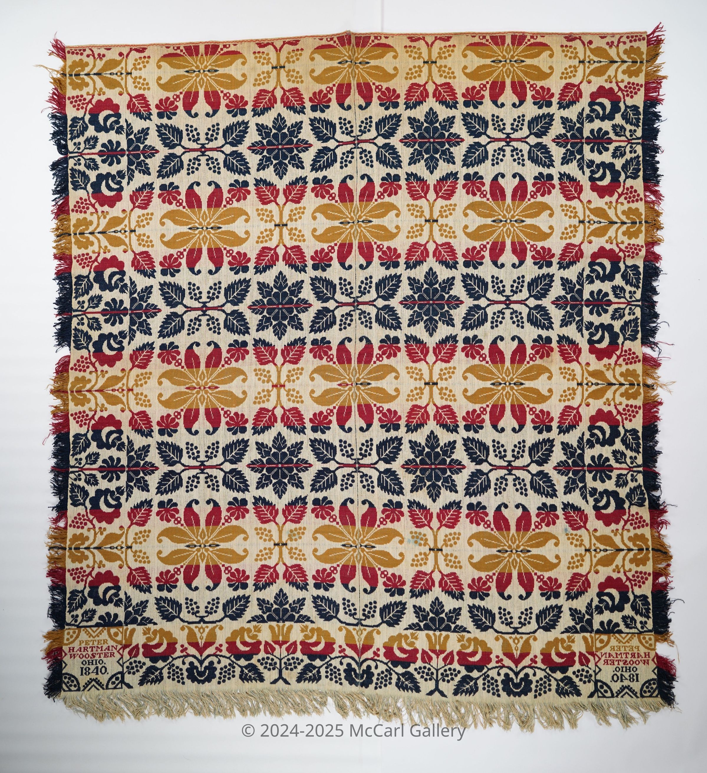 Navy, red, green, yellow, and natural figured tied beiderwand coverlet with self-fringe and rose/grapevine border on three sides. Woven by Peter Hartman in Wooster, Wayne County, Ohio in 1840.Collection