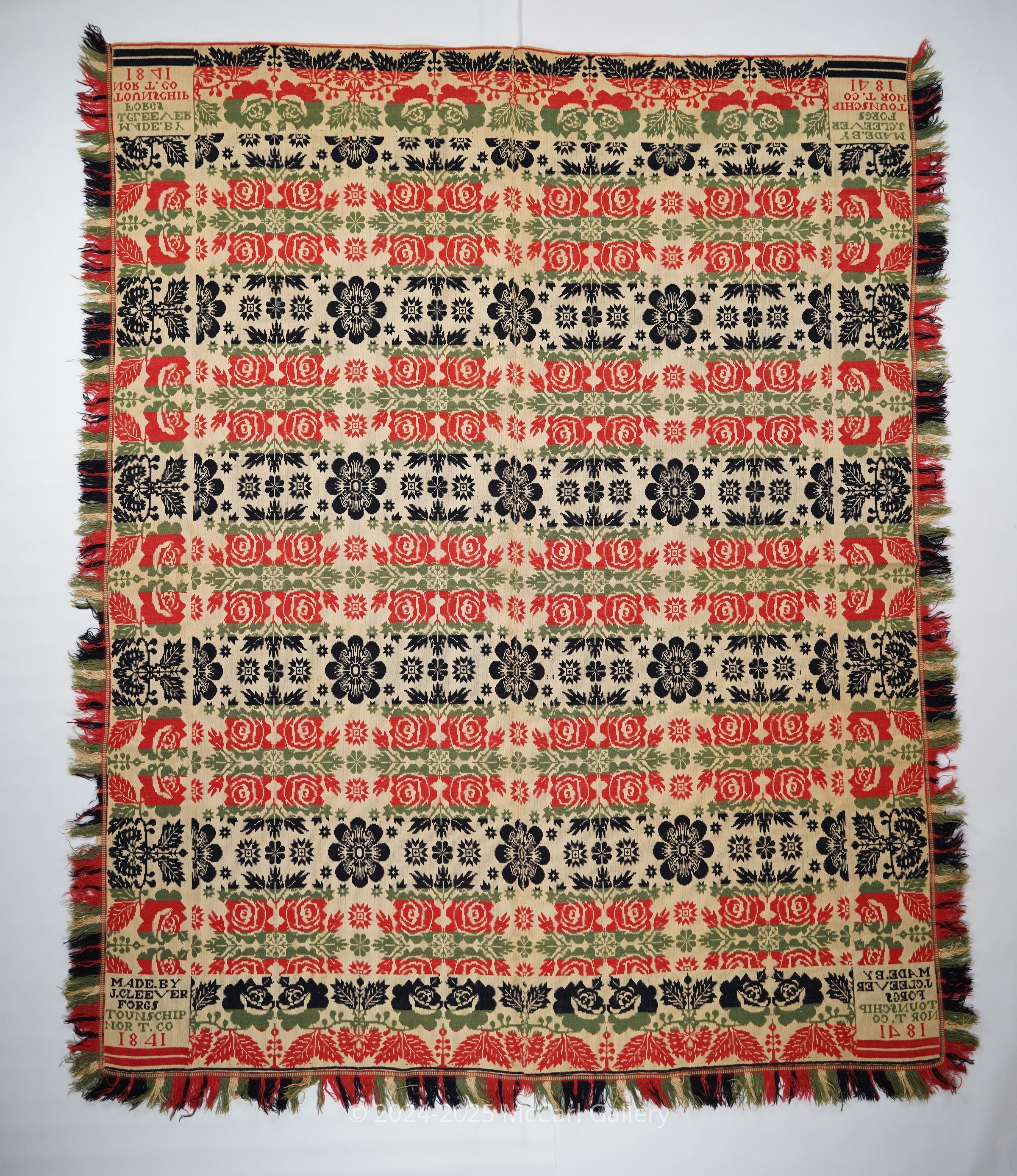 Green, red, navy, and natural figured tied half doublecloth coverlet with border and applied fringe on three sides. Two joined panels. Woven by John Cleaver in Forks Twp., Northampton Co., Pennsylvania in 1841.Collection