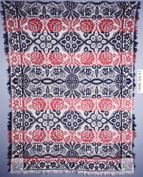 Figured coverlet; undyed cotton and red and blue wool, tied double cloth (Beiderwand). Center seam joins two panels. Hemmed top, fringed sides and bottom. The central motif consists of large roses in full bloom with rose buds trailing alongside. Alternating with the rows of roses are diamond shaped motifs which contain four circular flowers and four leaves. Borders on three sides contain a meandering floral vine.Collection
